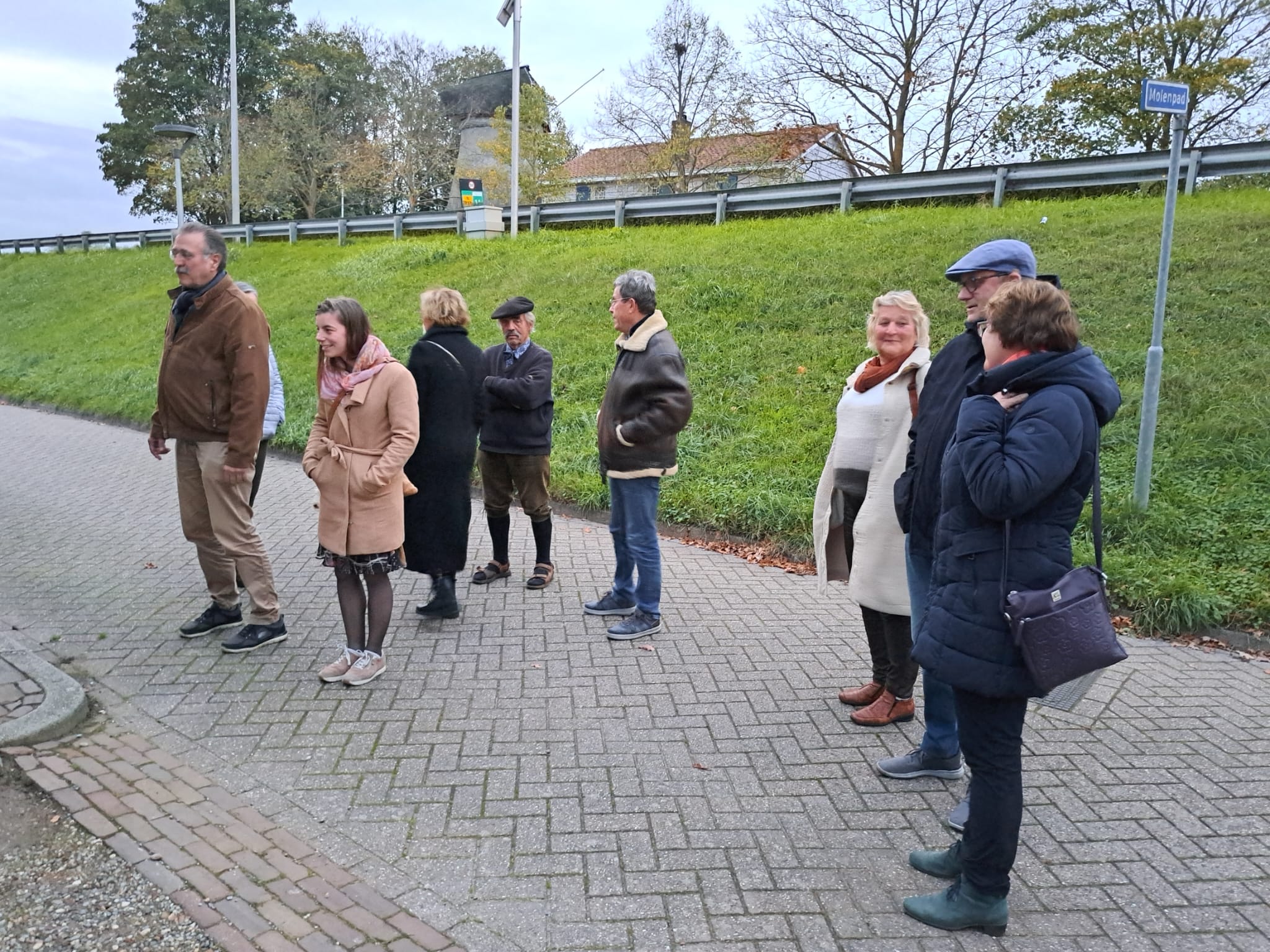 Om 17u ging de hele groep naar buiten en werden de kogelgaten van de buurman bekeken en besproken. Het grootste deel van het gezelschap begon daarna aan de wandeling naar hun maaltijd, een enkeling pakte de auto. Het restaurant is best een stukje weg, maar gelukkig werden we een deel ervan motorisch voortbewogen: We gingen met de pont de IJssel over naar Welsum, waar Eet Tapperij Bijsterbosch zich bevindt. Daar kon iedereen aan één grote tafel zetelen en werden we op onze wenken bediend door een duo vrolijke serveersters.