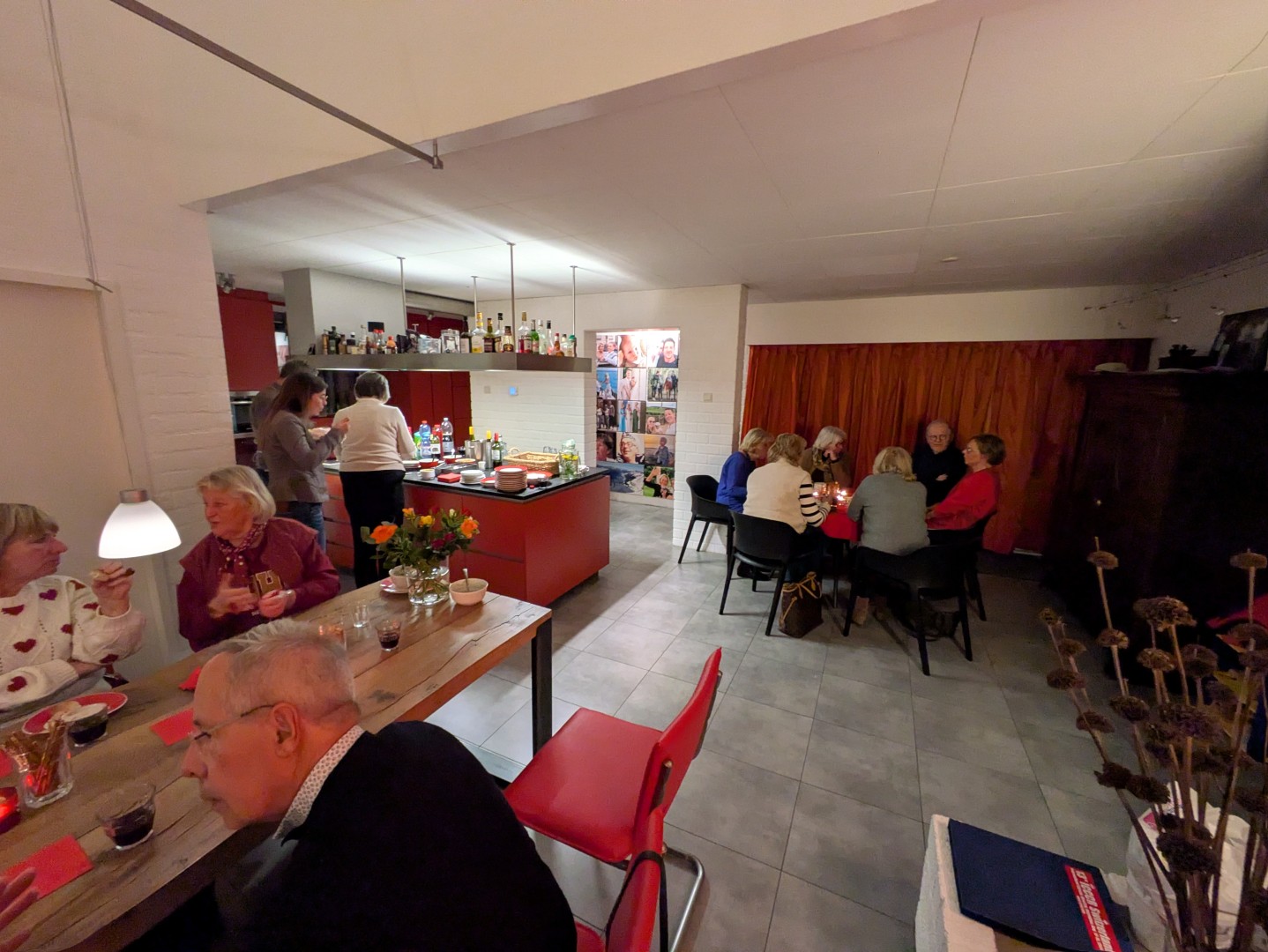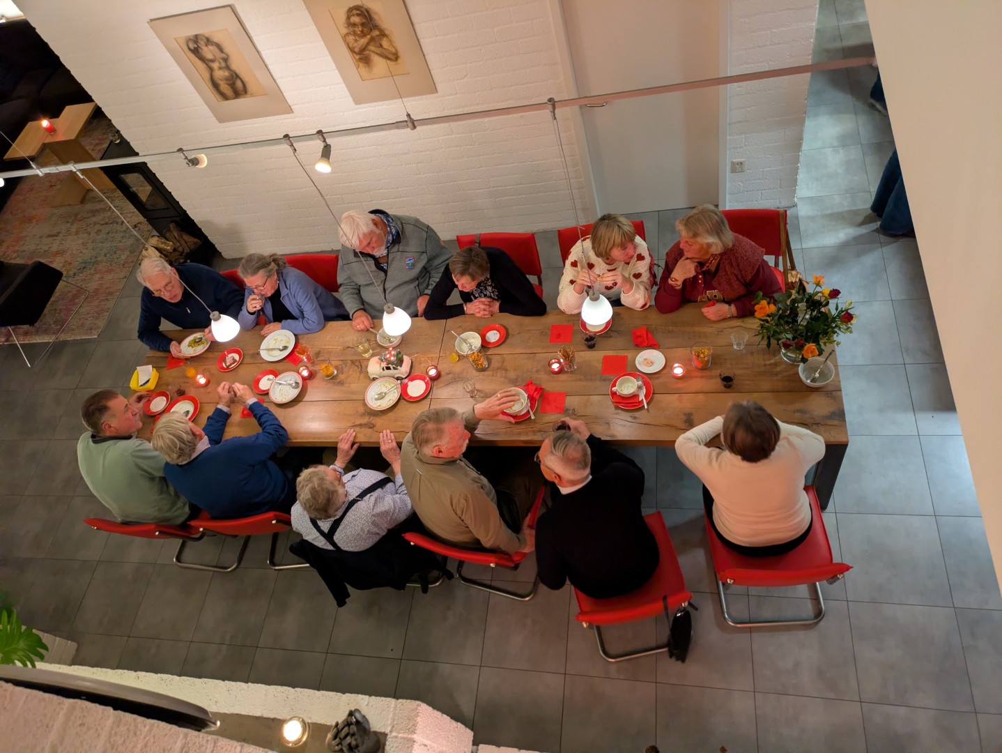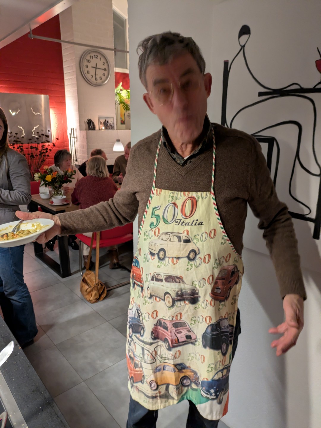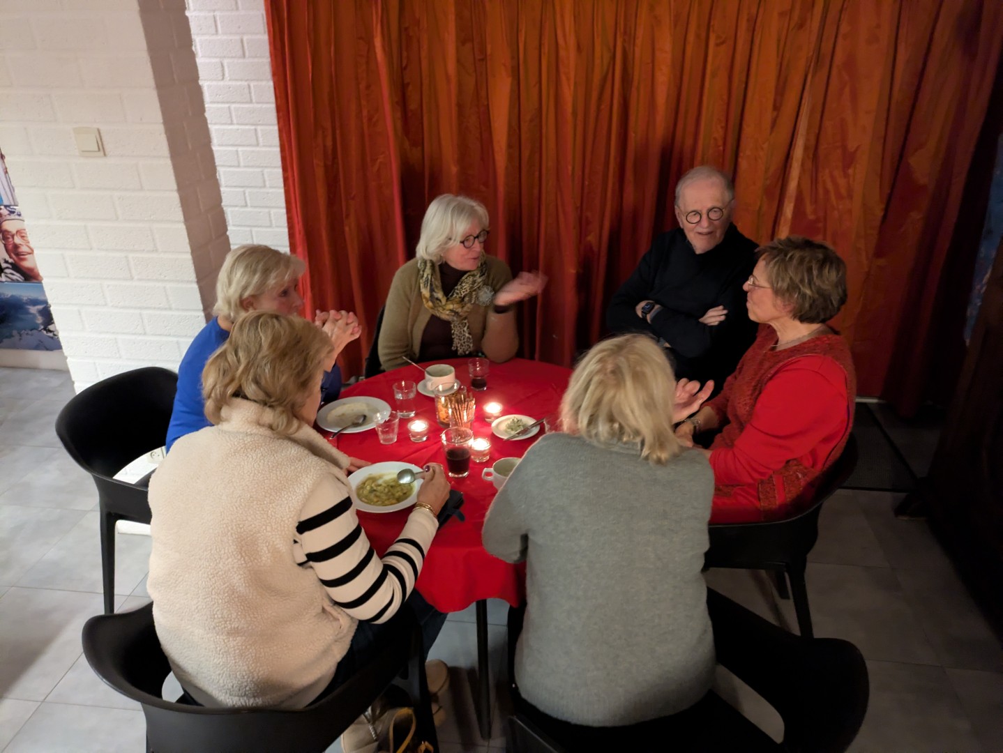 Binnen was het behaaglijk en gezellig met ruim 20 personen opkomst. 18 liter erwtensoep en een flinke pan pompoensoep stonden al op te warmen, want iedereen weet dat soep na een keer afkoelen alleen maar lekkerder wordt. Frans schijnt ochtenden bezig te zijn geweest met handmatig snijden van alle ingrediënten. Ouderwetse noeste arbeid, dat heeft hij mooi voor ons over! En dat in zijn Fiat-keukenschort... De pompoensoep was van Mirjams hand en ze deed er zelf nogal luchtig over, maar ook die smaakte geweldig!