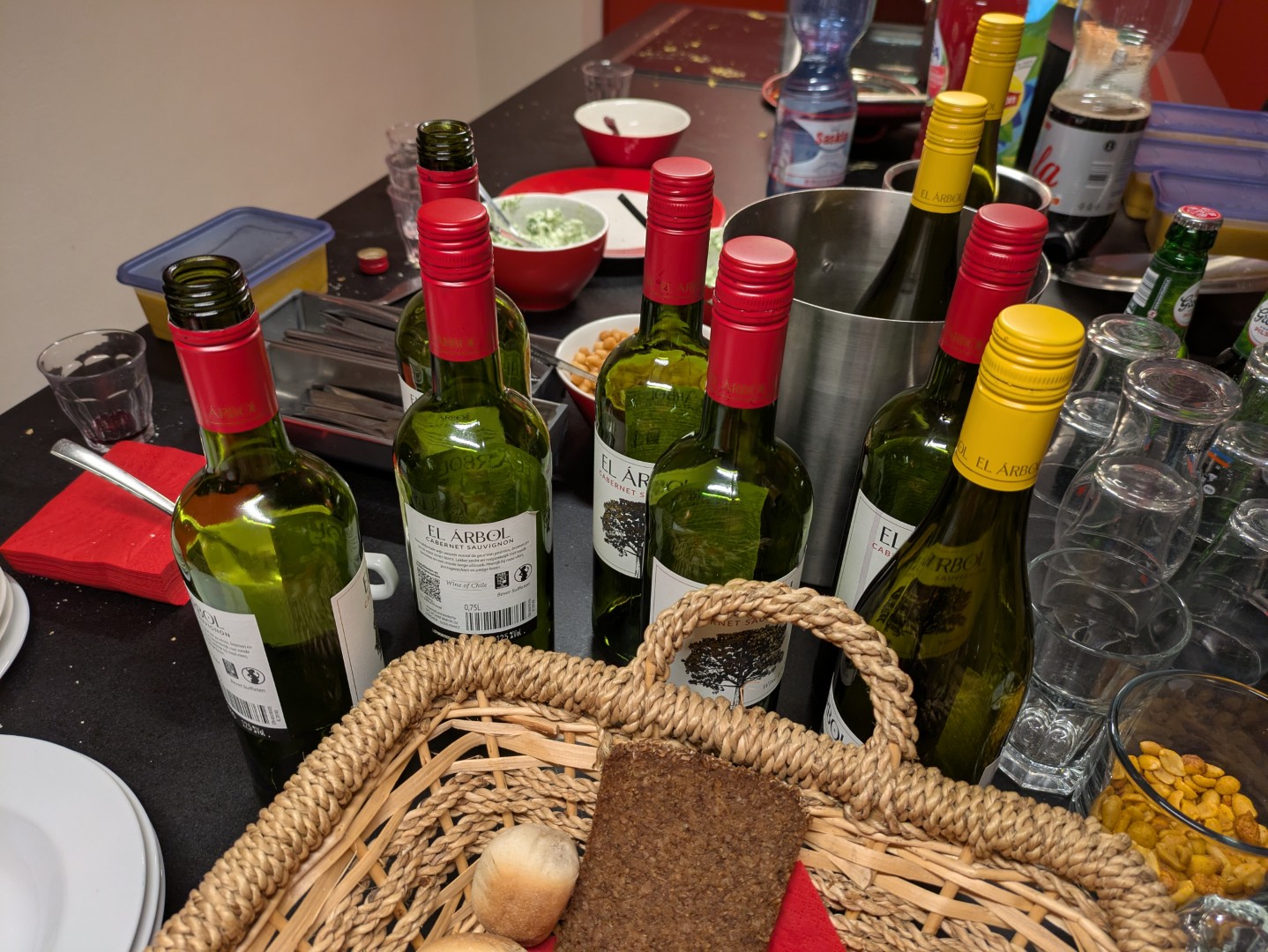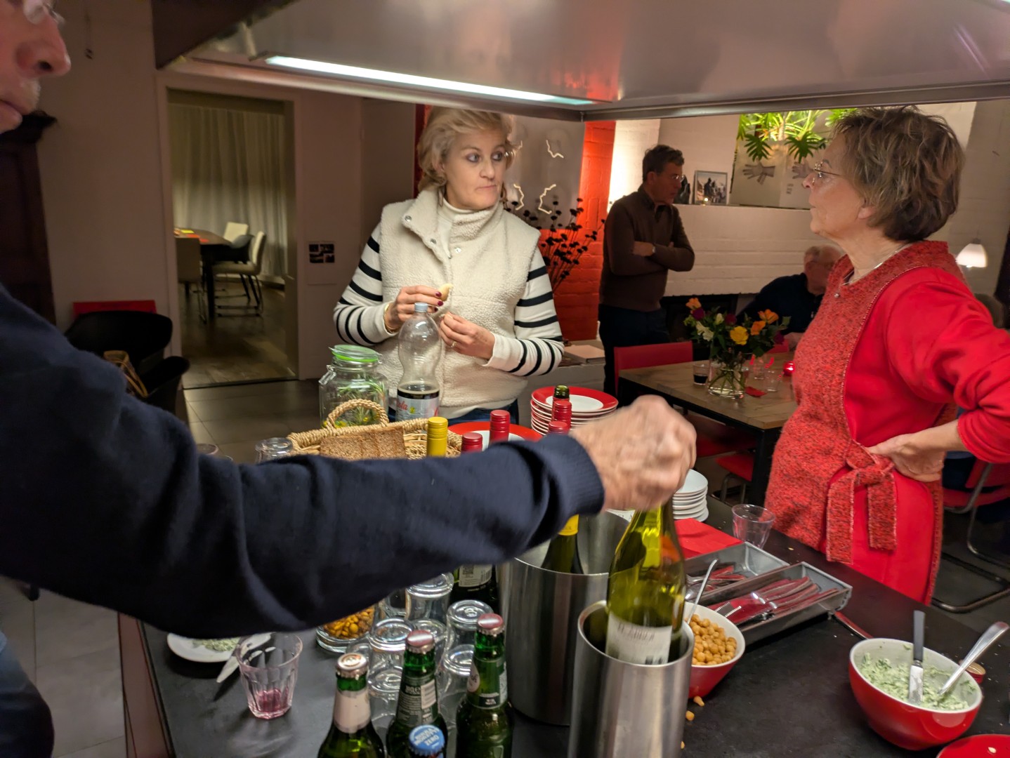 Bij soep horen knabbels en bijgerechten, ook dat was perfect georganiseerd. Op de foto zie je dat degenen die niet 'de Bob' waren de wijnflessen goed wisten te vinden. Frans en Mirjam, enorm bedankt en jullie hebben je aan de belofte gehouden dat het echt véél beter kan. Complimenten!