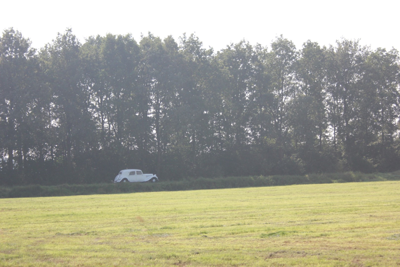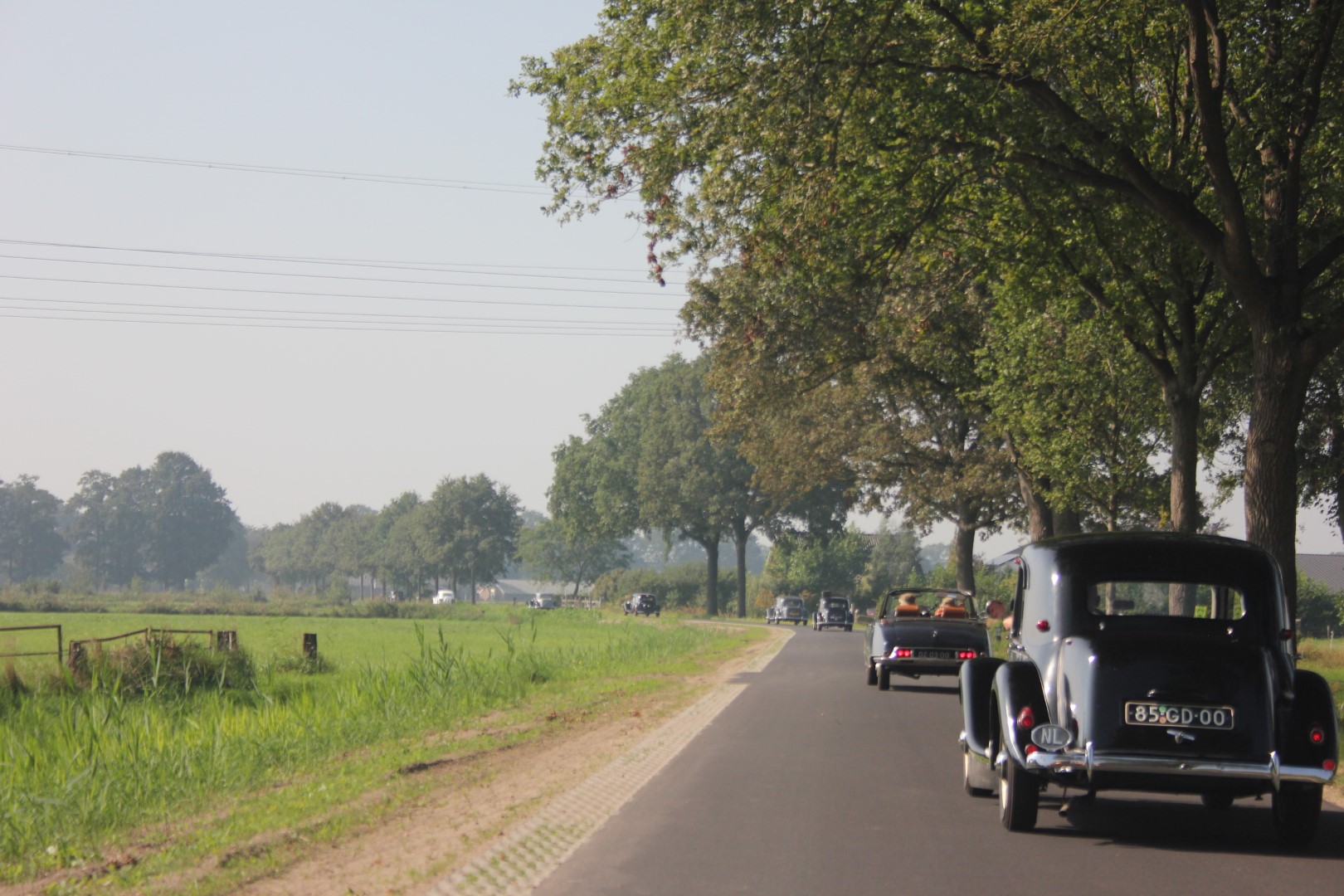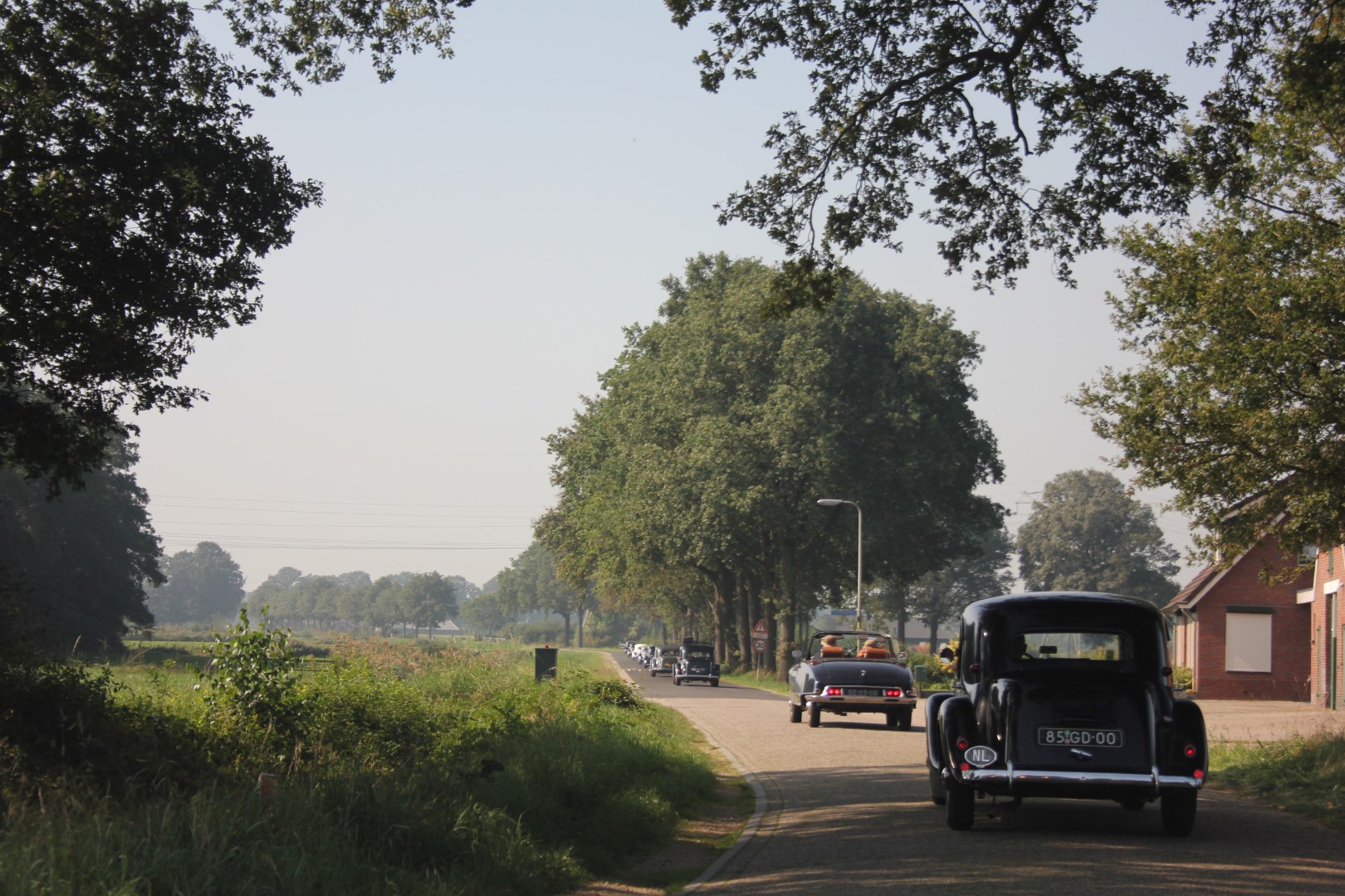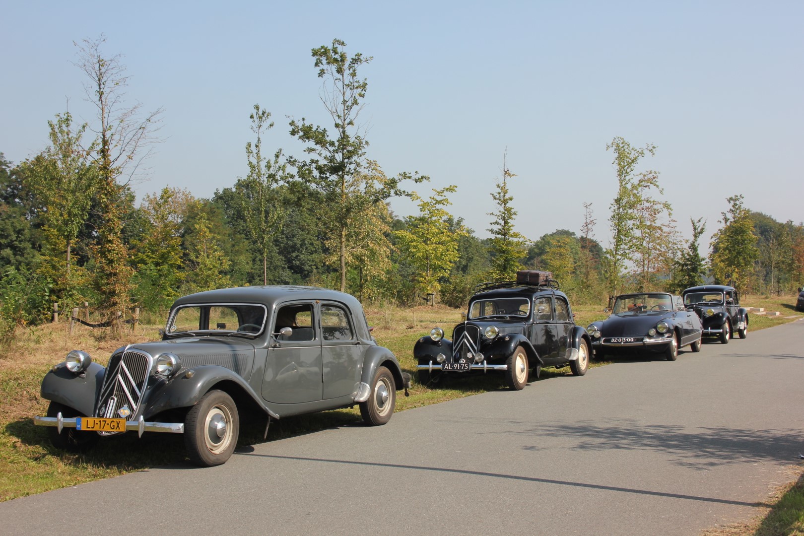 Het vorige verslag eindigde met een wens voor beter weer de volgende keer. Ik had om iets minder moeten vragen, want het was haast té warm afgelopen zaterdag. Net terug van vakantie besloot ik last minute toch maar aan te sluiten bij deze activiteit, het vertrekpunt was tenslotte toch om de spreekwoordelijke hoek. Ik had alleen geen tijd om de Traction nog op te halen in Azelo, dus men moest tegen een iets minder oude Citroën aan kijken. Ik heb me braaf achteraan uit het zicht van iedereen gehouden.