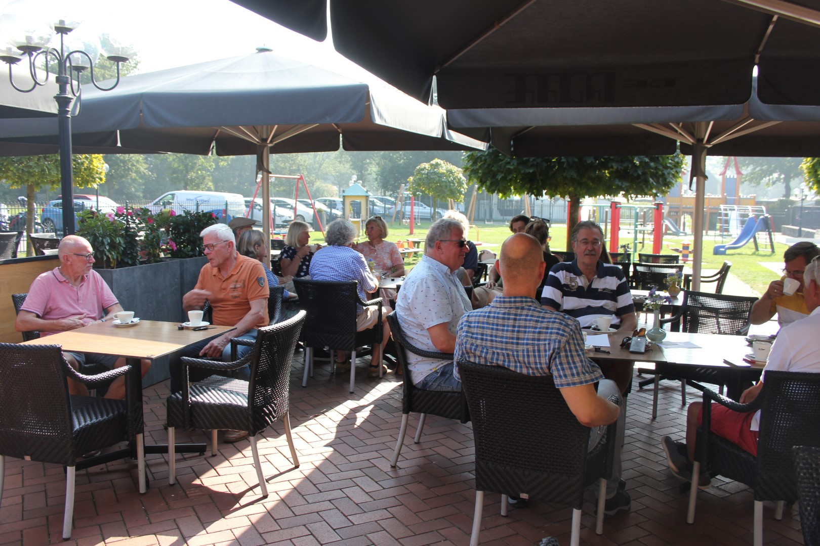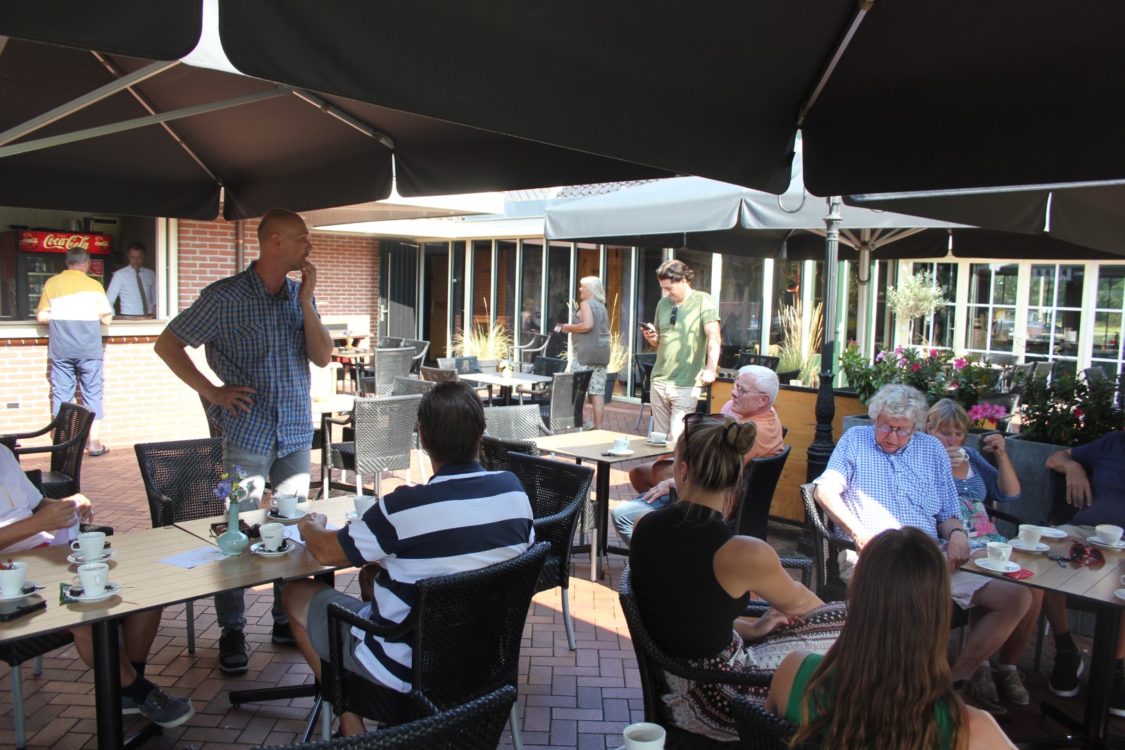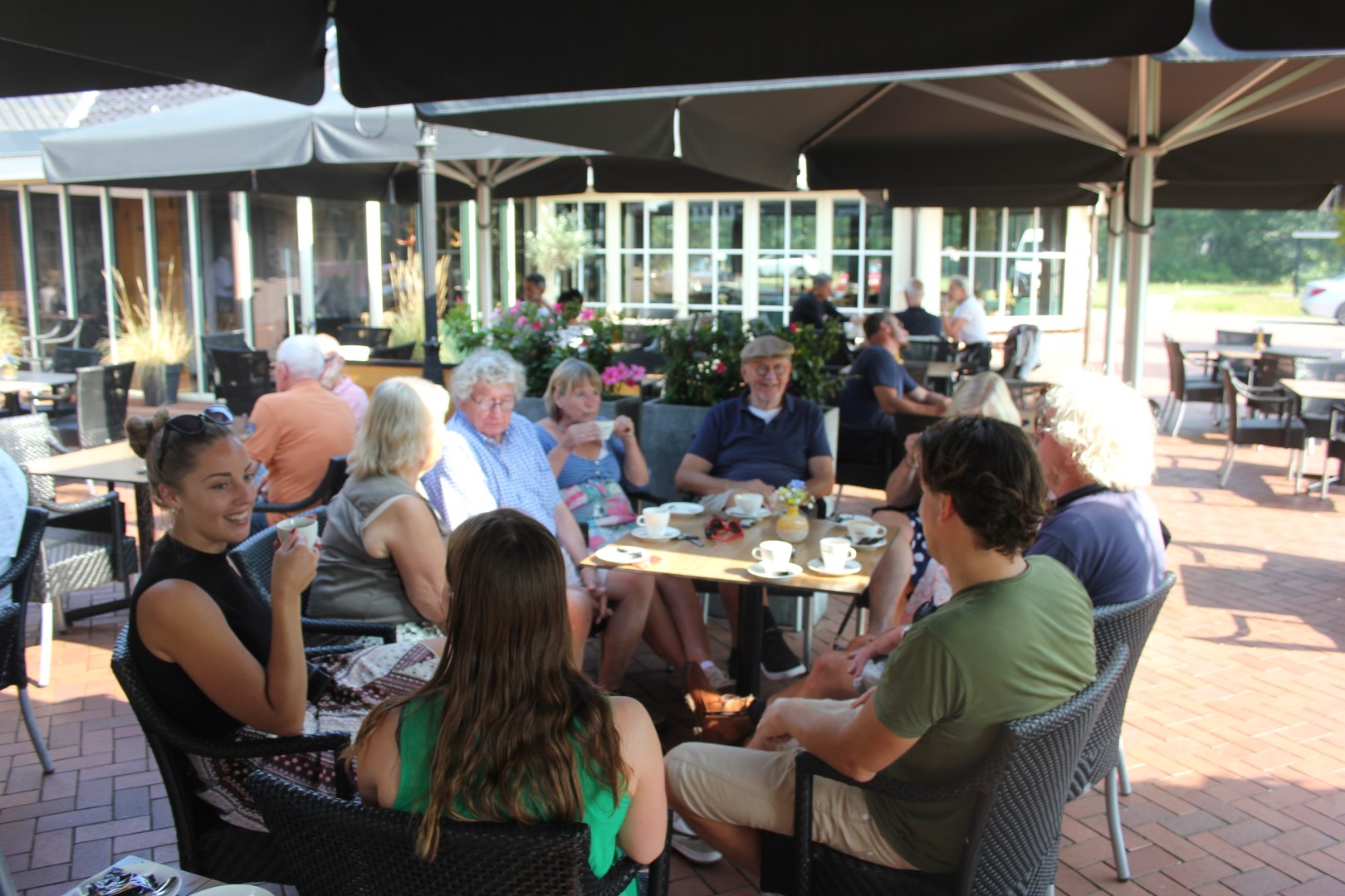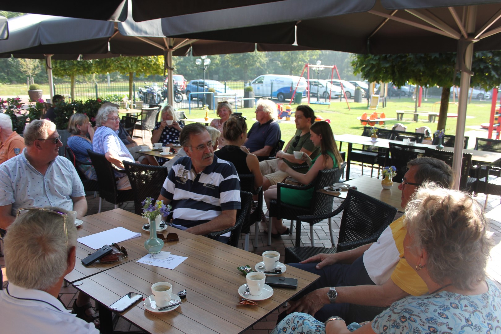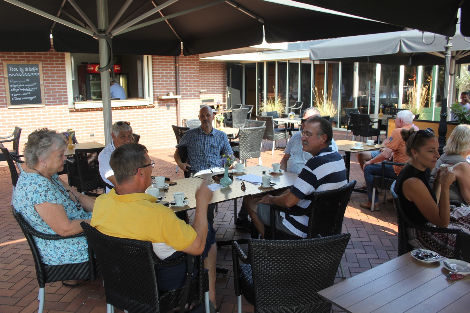 Naast de A1 bij Markelo verzamelden we bij De Poppe, waar we aan gereserveerde tafels mochten plaatsnemen voor de koffie, mits we niet te lang zouden blijven hangen. Een goed excuus om op tijd te vertrekken. Aangezien Andre geveld was door een onsteking nam Wilbert het woord. Hij legde uit dat het bezoek aan de stoomhoutzagerij al jarenlang een idee was van Rie en Maarten, maar het kwam er niet van. Nu het dan toch zo ver was voelde Rie zich nog zo betrokken bij het idee dat ze Andre heeft geholpen de rit uit te zetten. Hulde!