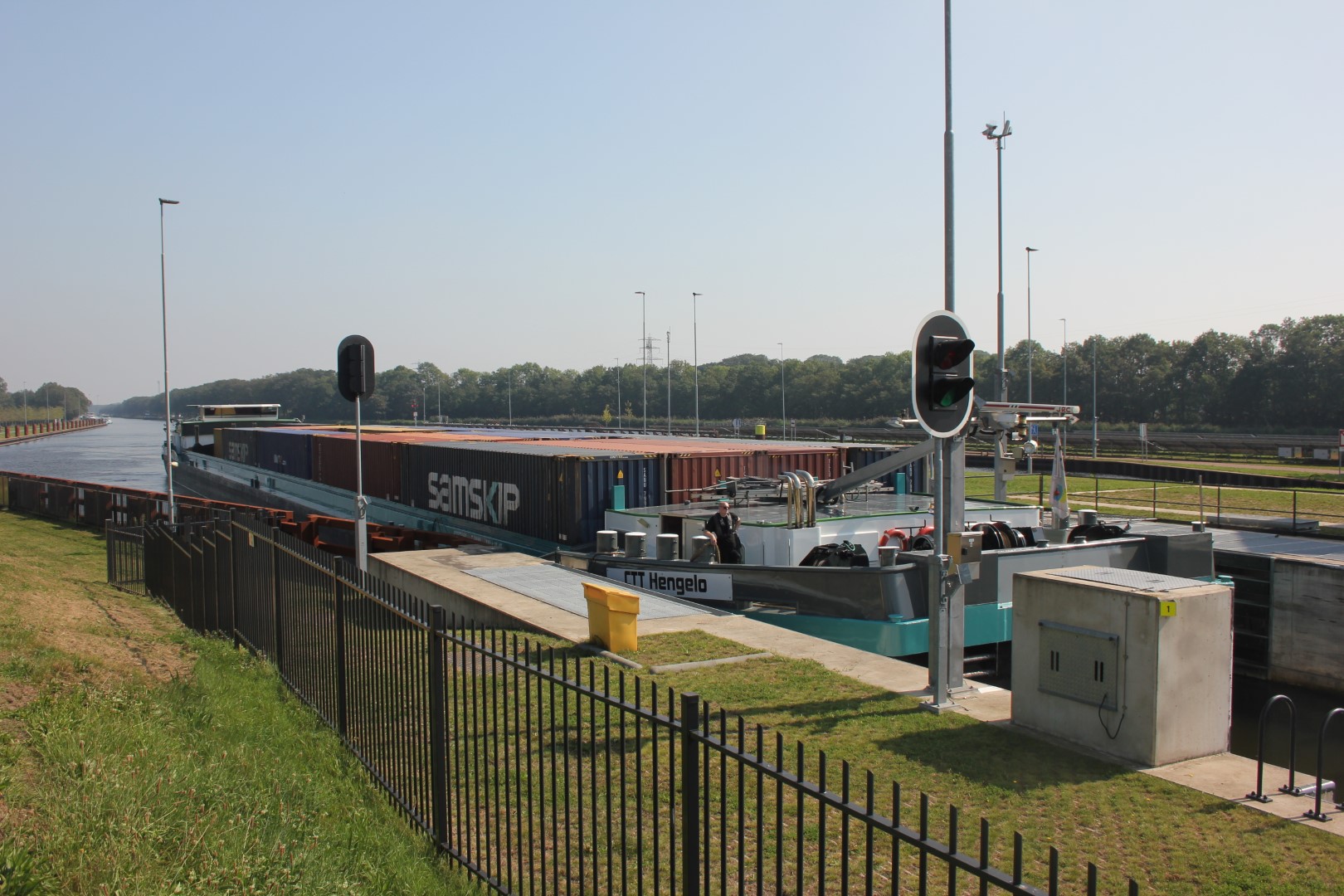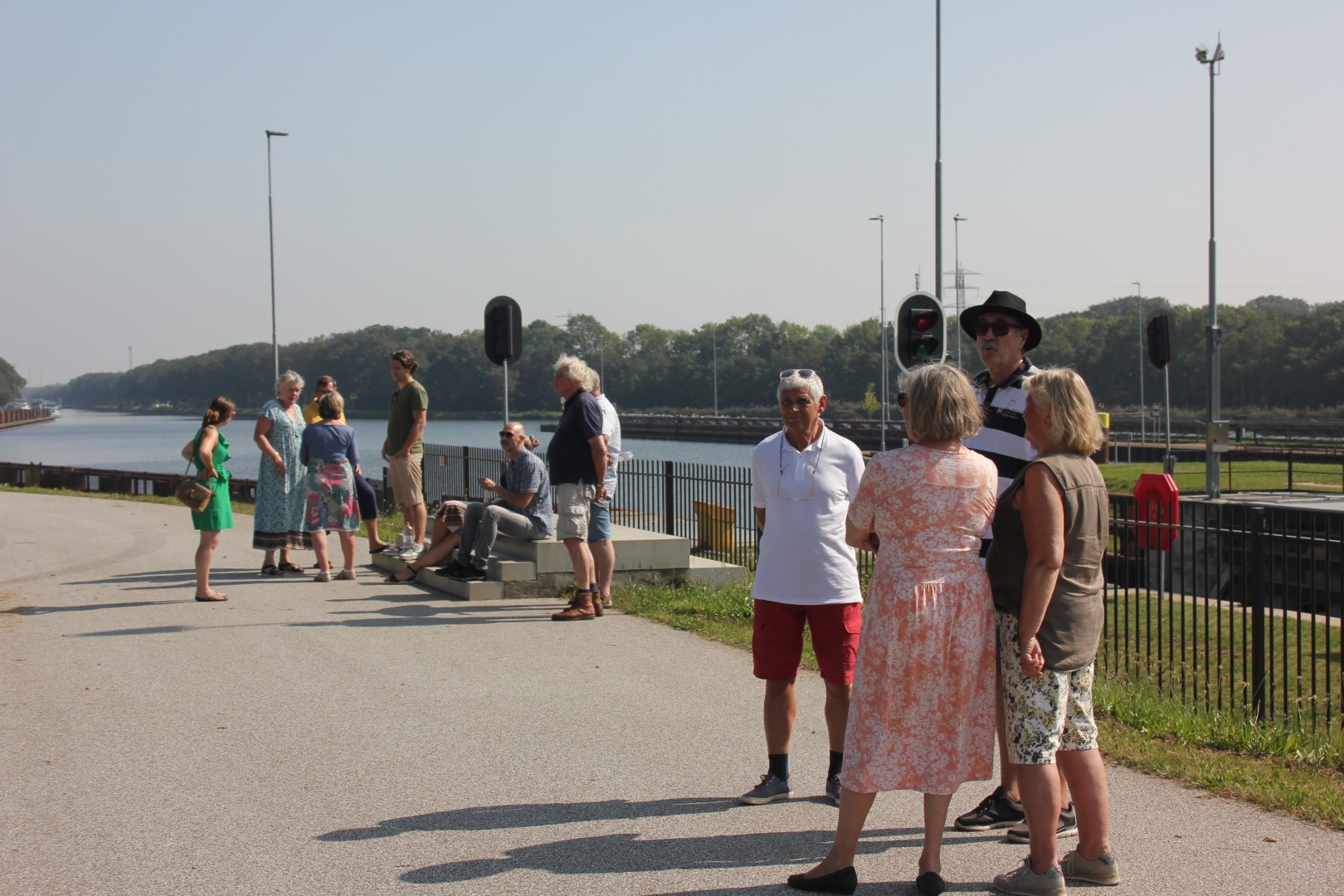 Tien auto's vertrokken in westelijke richting. Het eerste stuk konden we goed meters maken, met flinke afstanden tussen de aanwijzingen. We moesten ook nog een stuk, dat kwam goed uit. Bij het sluiscomplex bij Eefde werd gepauzeerd. Die sluizen zijn vrij recent gerenoveerd en uitgebreid, wat informatieborden lichtten dat proces toe. Toen de meesten wilden vertrekken kwam er net zo'n schip aan varen, wat enkelen deed besluiten om achter te blijven om het schutten te volgen. Zo'n schip van ruim honderd meter wordt dan met centimeters speling de sluis in geloodst. Indrukwekkend.