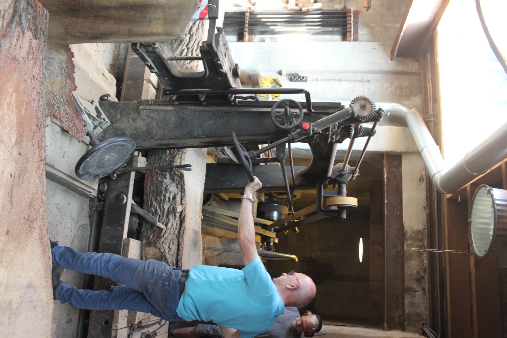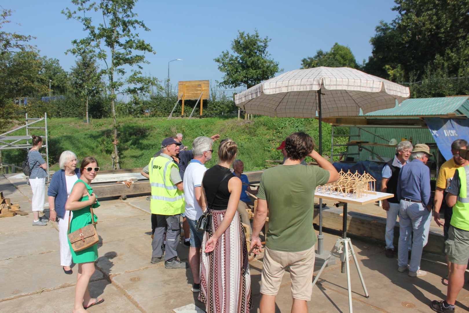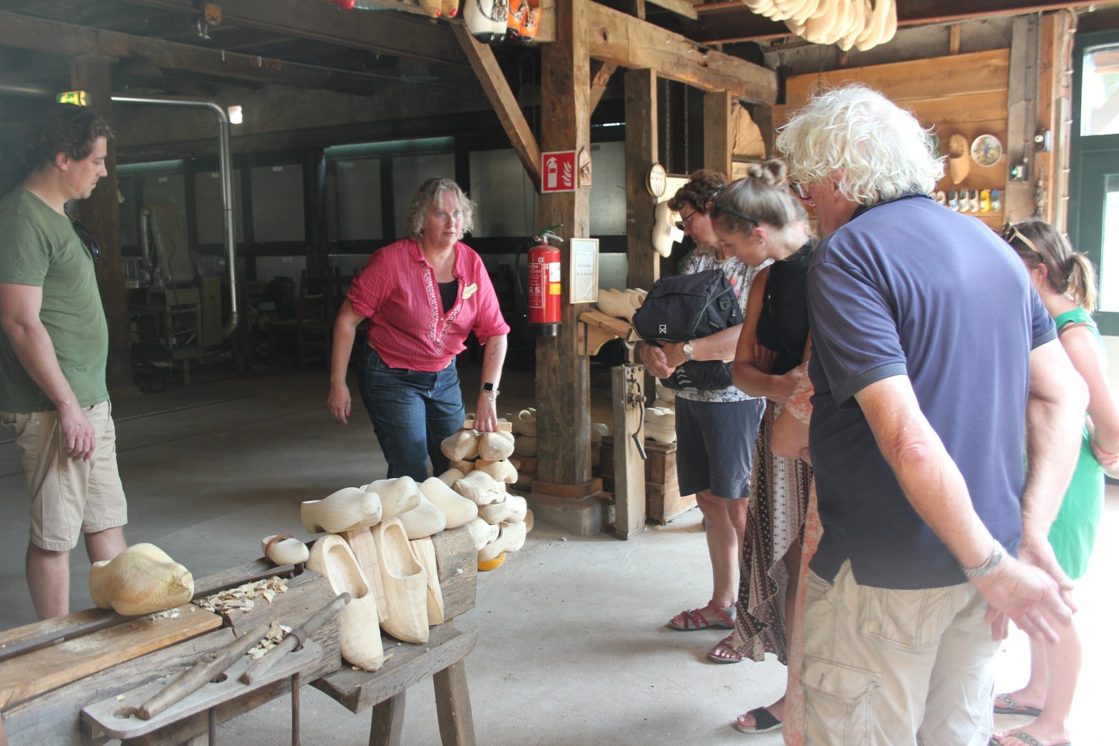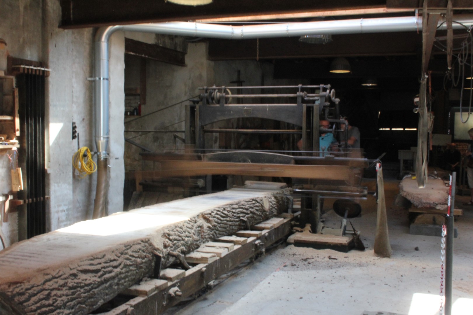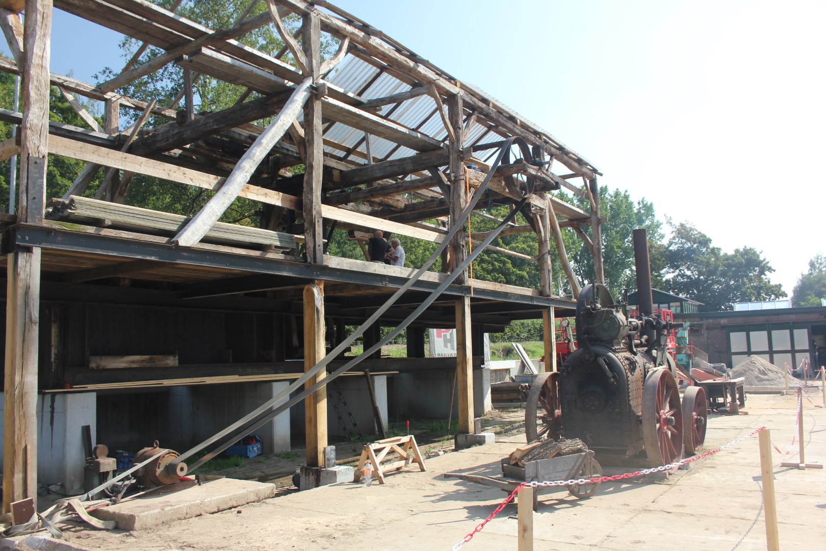 De stoomhoutzagerij was geopend en goed bemand voor Open Monumentendag. Het bleek een stuk uitgebreider dan verwacht. Waar volgens de locals enkele jaren geleden niet meer was dan een klompenmakerij, was nu het hele complex er omheen in beheer van een stichting die oude ambachten in stand houdt. De zagerij die met een elektromotor van 100 jaar oud werkt, was daarvóór een stoomzagerij, en dat hebben zij als naam gekozen omdat het tot de verbeelding spreekt. Om die naam ook waarheidsgehalte te geven, zijn ze bezig met het opbouwen van een enorme verticale stoomzaag, waar zowat een heel gebouw omheen zit dat erbij hoort. Ze waren net op tijd klaar om die te laten draaien, het zij nog zonder stoomaandrijving. Wel stond er een stoommachine naast die geur en geluid toevoegde voor de sfeer.