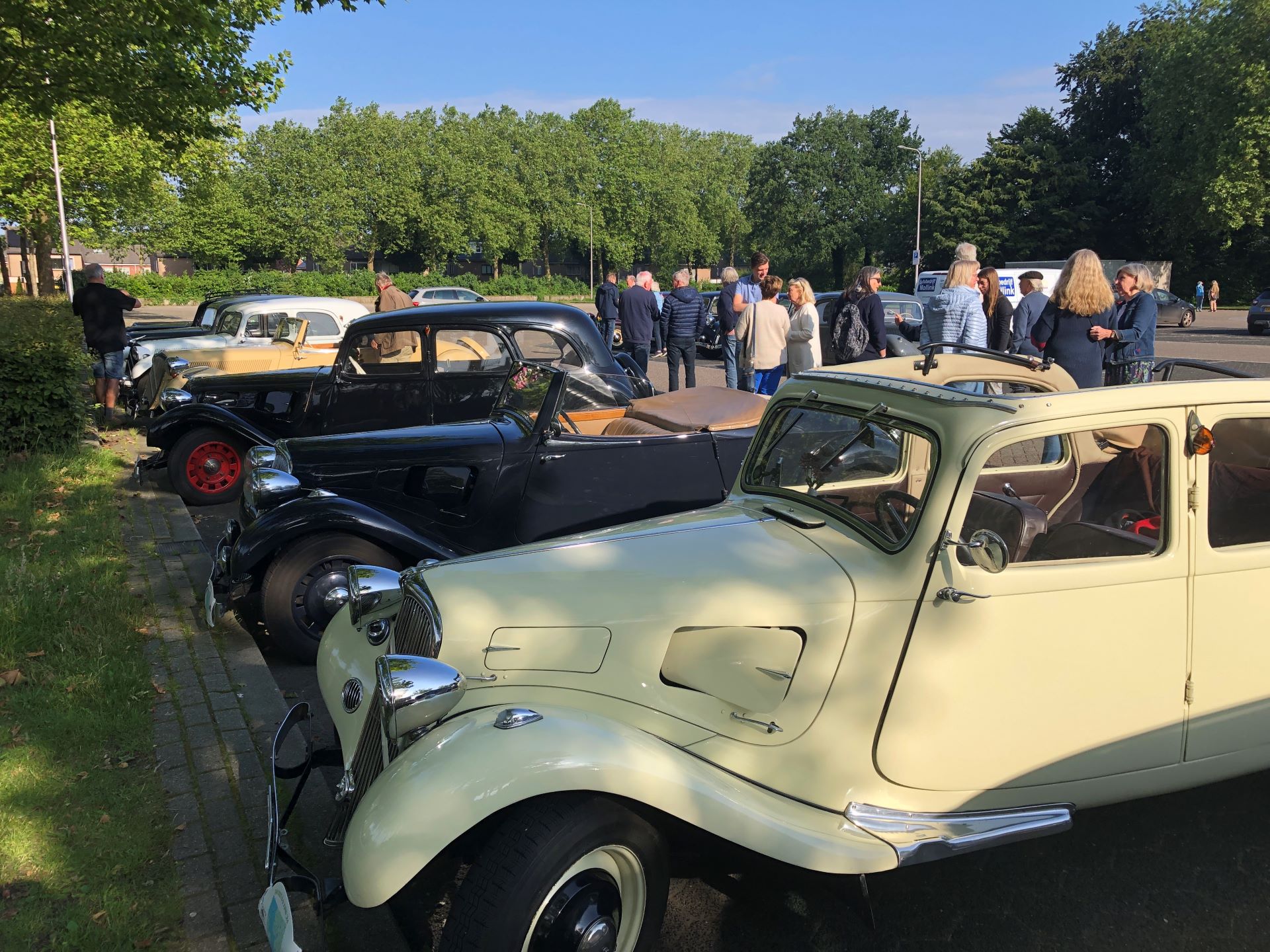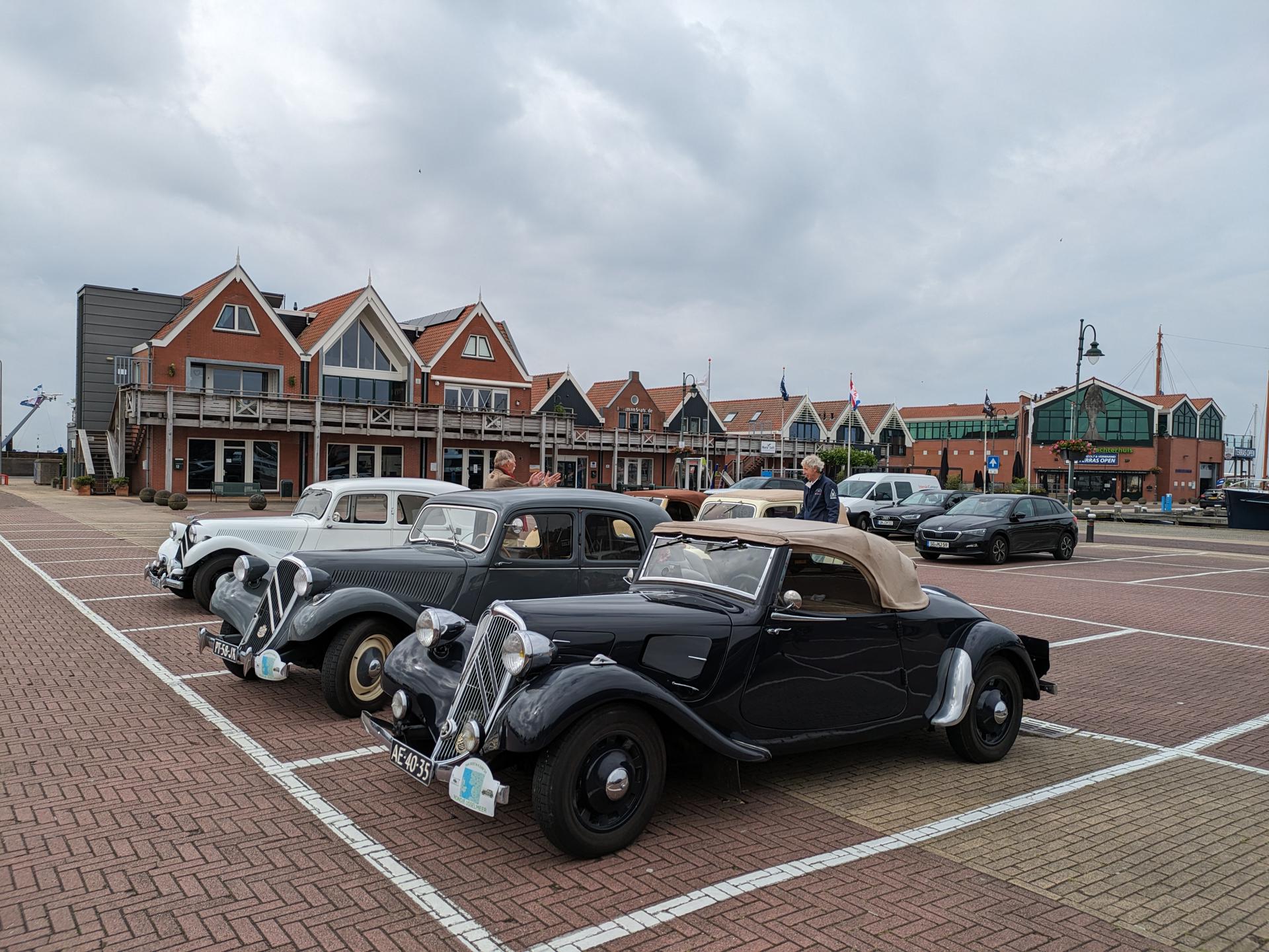 Hoe dan ook, op zaterdagochtend verzamelden we op tijd in Raalte, om richting Urk te vertrekken voor koffie. Blijkbaar zijn ze in Urk niet van vroeg opstaan, want om half 11 was het lastig om een open gelegenheid te vinden waar we koffie konden drinken. Dat lukte uiteindelijk, mits we op het terras plaatsnamen. Met uitzicht op de haven was het beter uit te houden dan we van tevoren hadden ingeschat. Maar we moesten door. Op naar Lemmer voor de lunch. De Traction van Hans C. had wat aanmoediging nodig (enkele duwtjes van ons en omstanders), maar dat was te repareren met een extra massadraadje tussen bobine en accu. Wederom met uitzicht op water konden we van het twaalfuurtje genieten.
