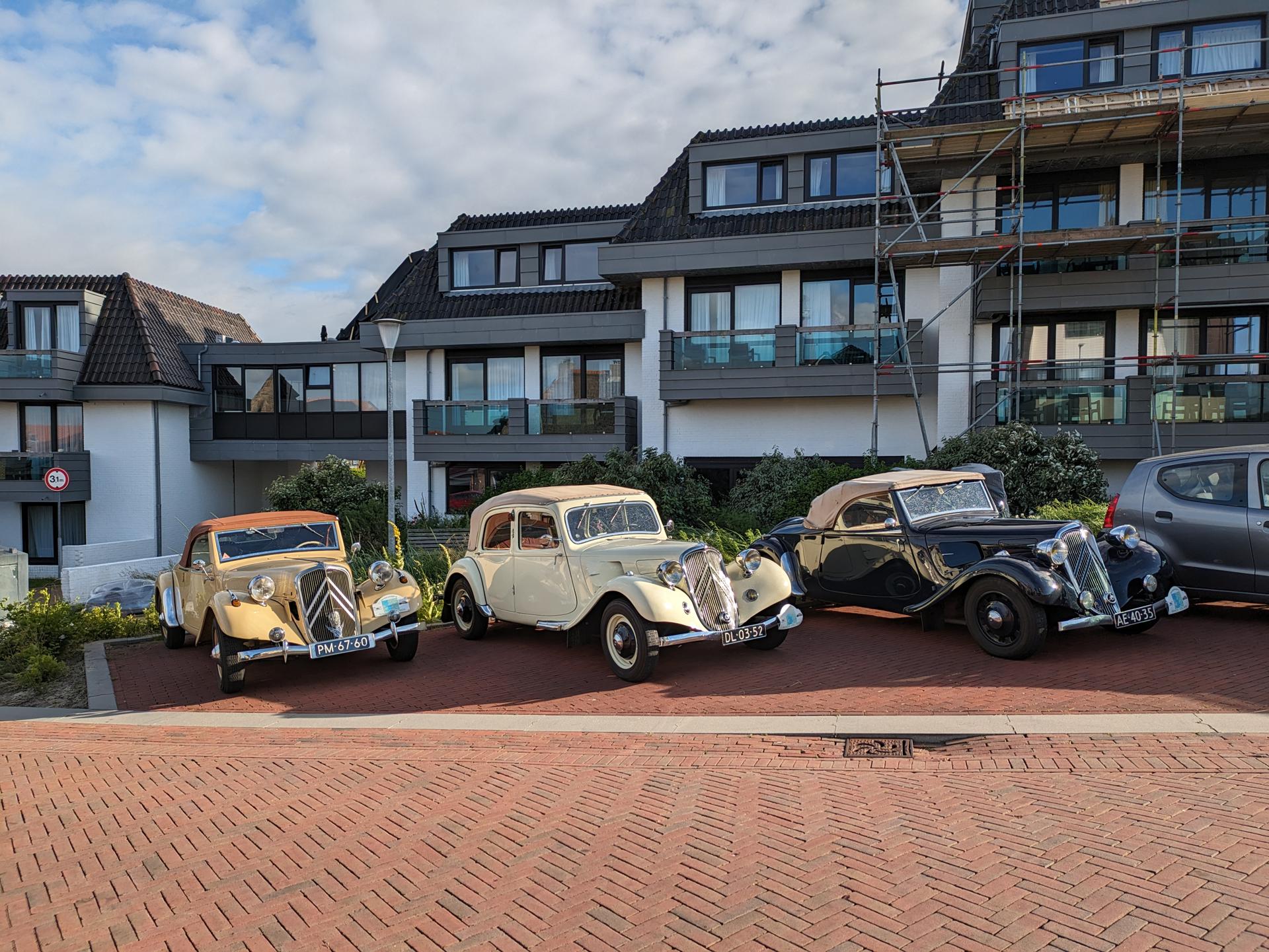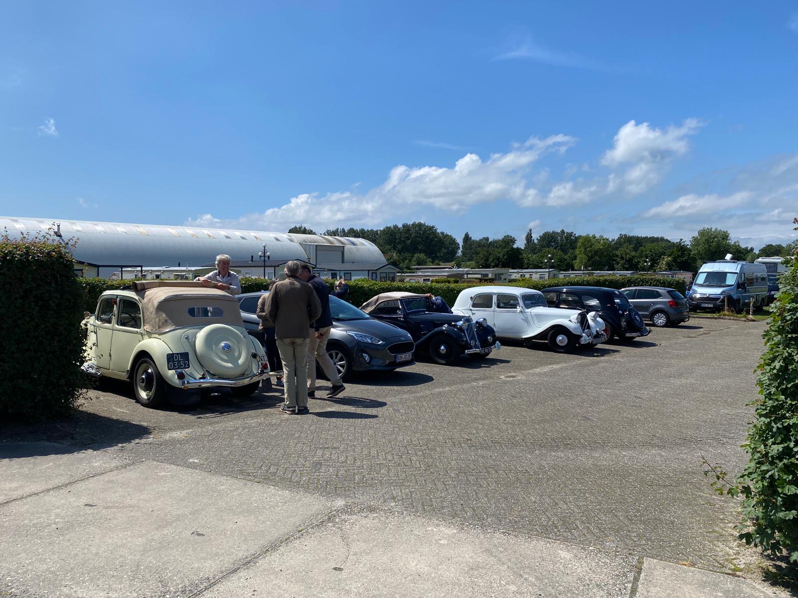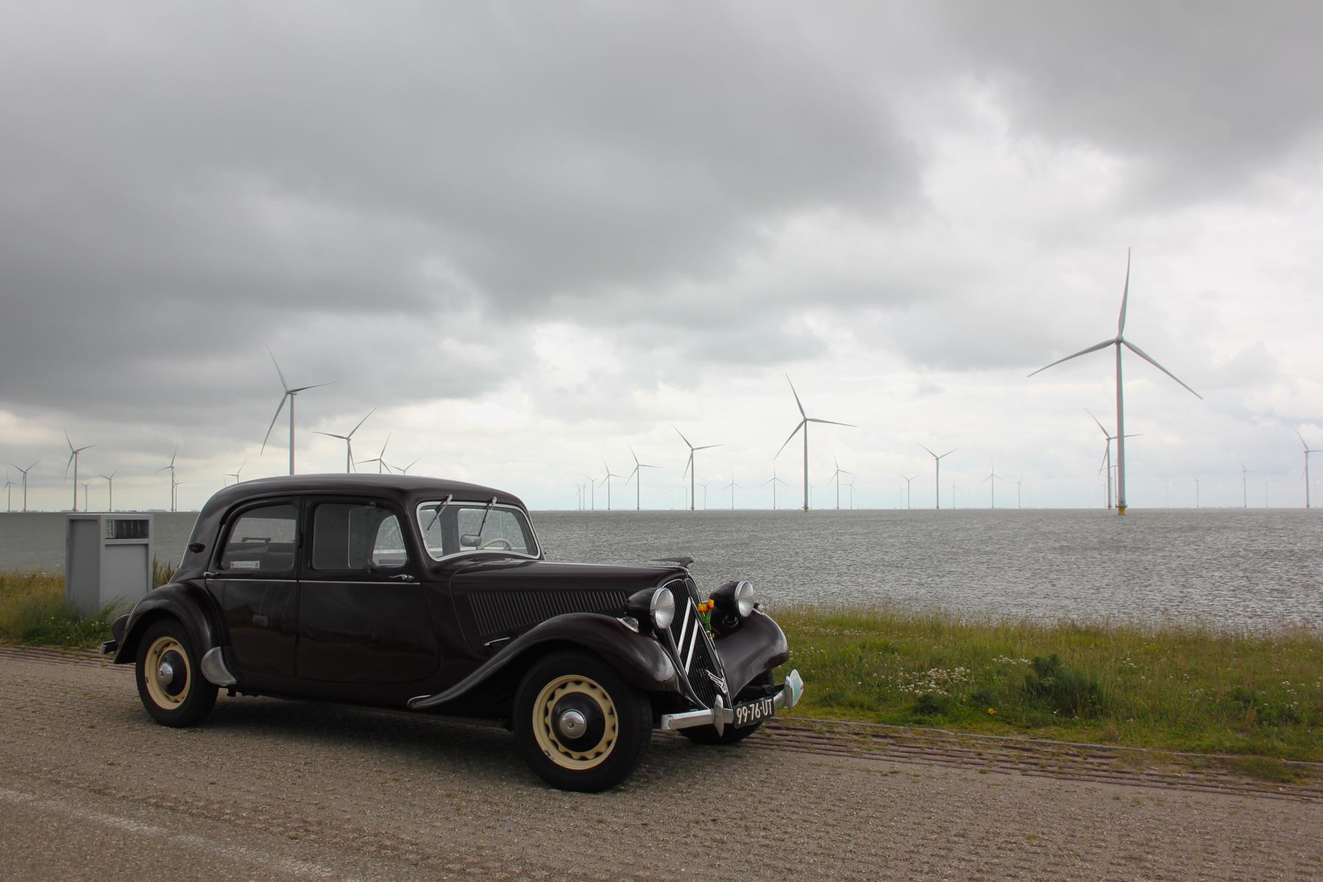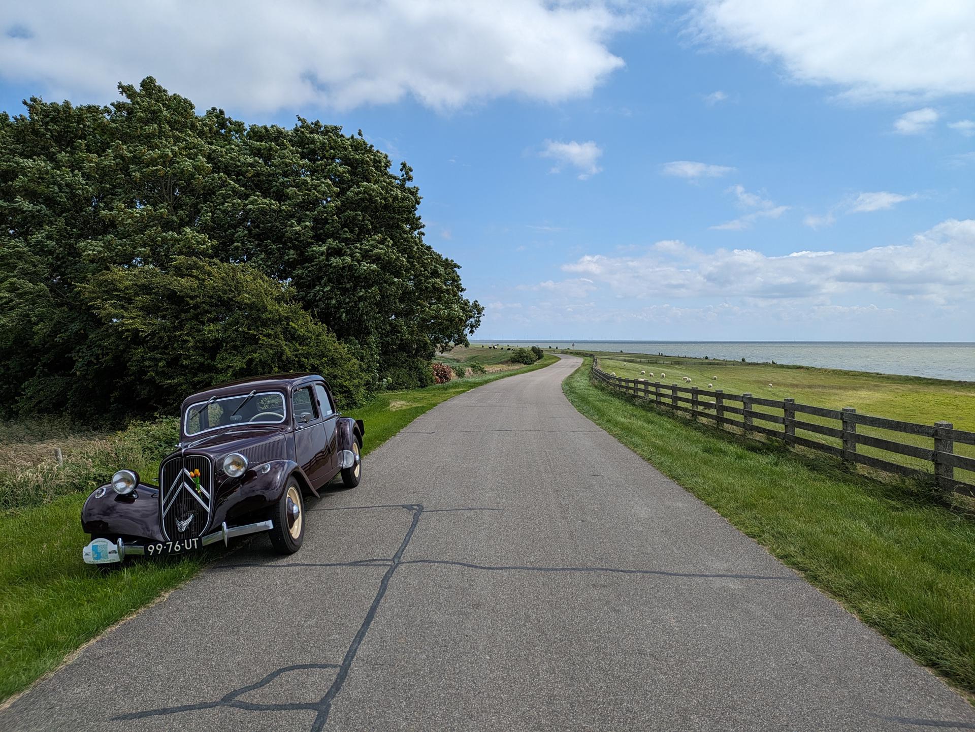 De drankjes smaakten en het eten erna net zo goed. Het wachten tussen de gangen werd verlicht door historie en anekdotes vanuit Oost-oprichter Benno en (al heel lang) lid Hans t.H. De avond was nog lang gezellig... Na een goede nacht slaap (en een paar baantjes in het zwembad voor sommigen) zaten we zondag op tijd aan het ontbijt met uitzicht op zee. Bij vertrek waren Mariëlle en ik nog niet genoeg uitgewaaid, dus wij zijn nog even naar Lange Jaap gelopen en hebben de Traction op de dijk gefotografeerd. Daardoor kwamen we pas bij Enkhuizen weer achterop bij de rest.