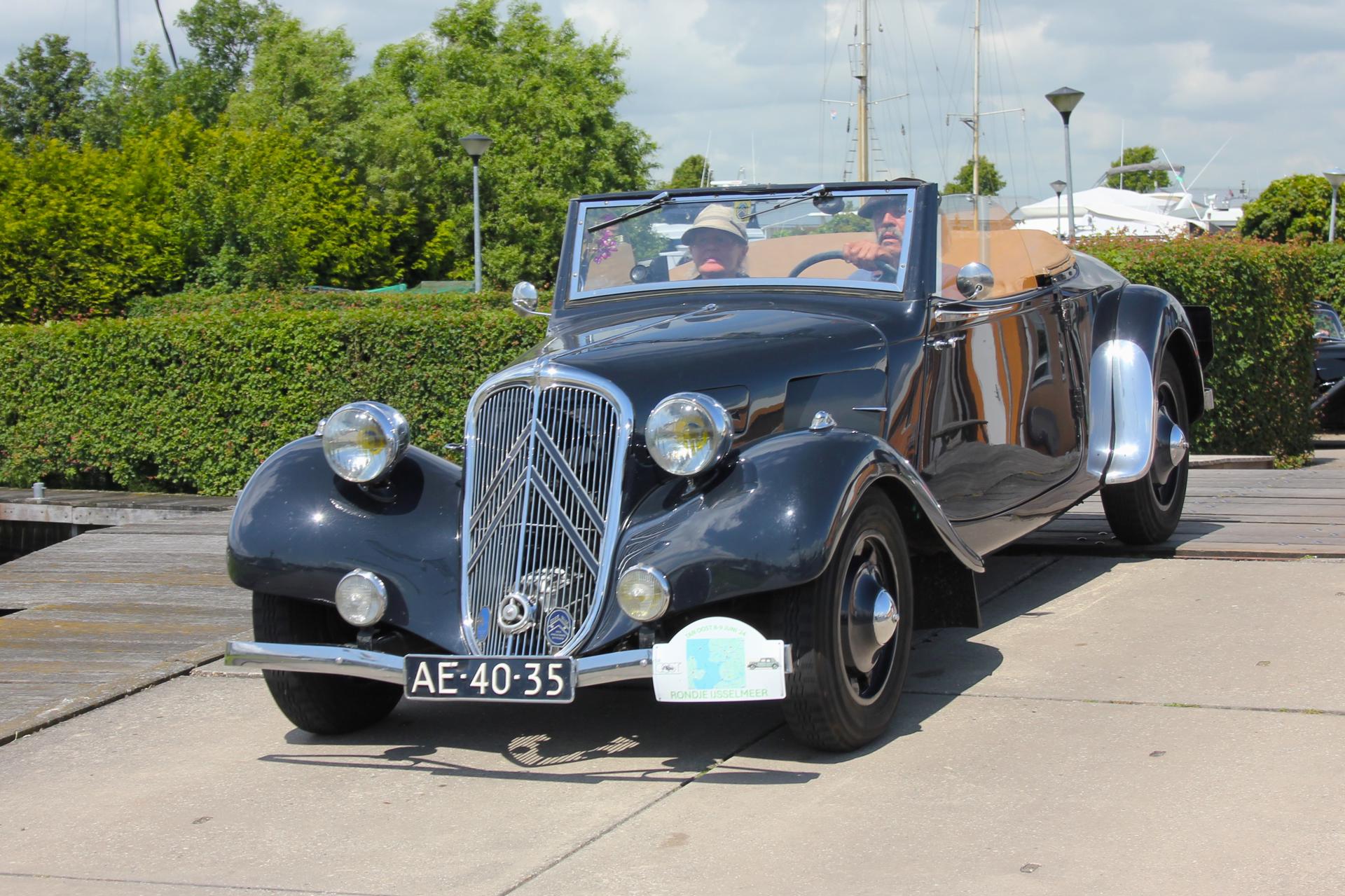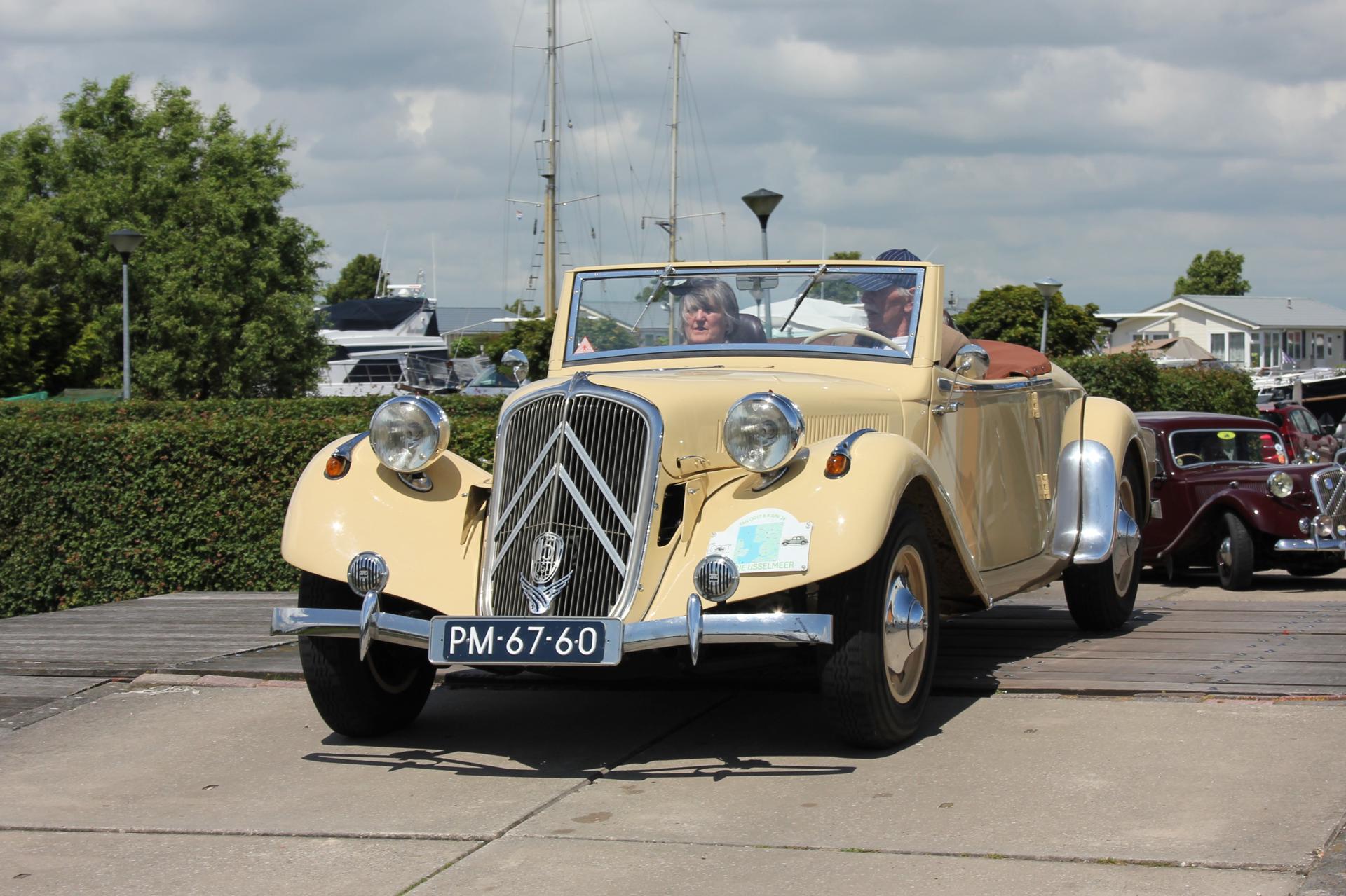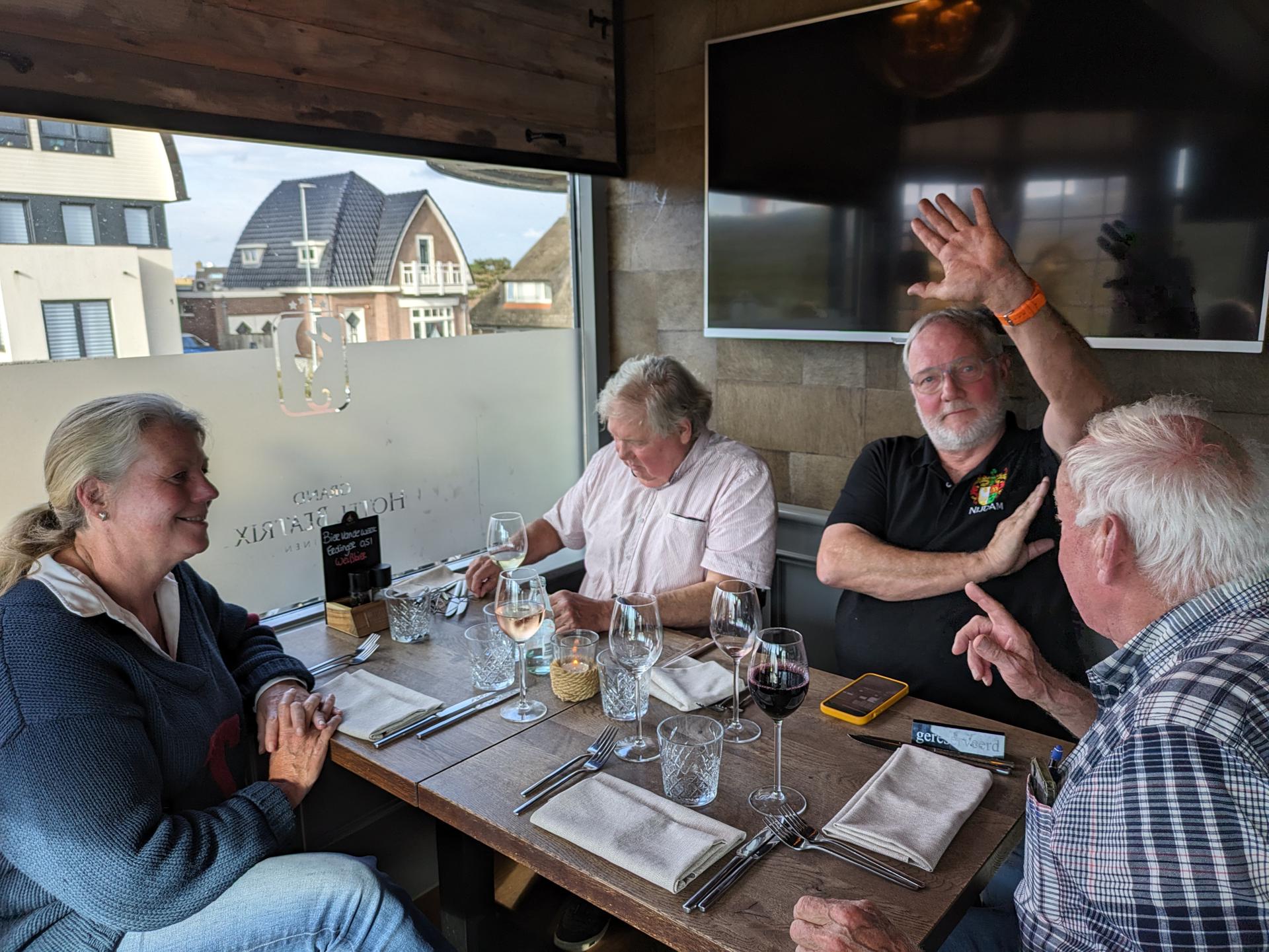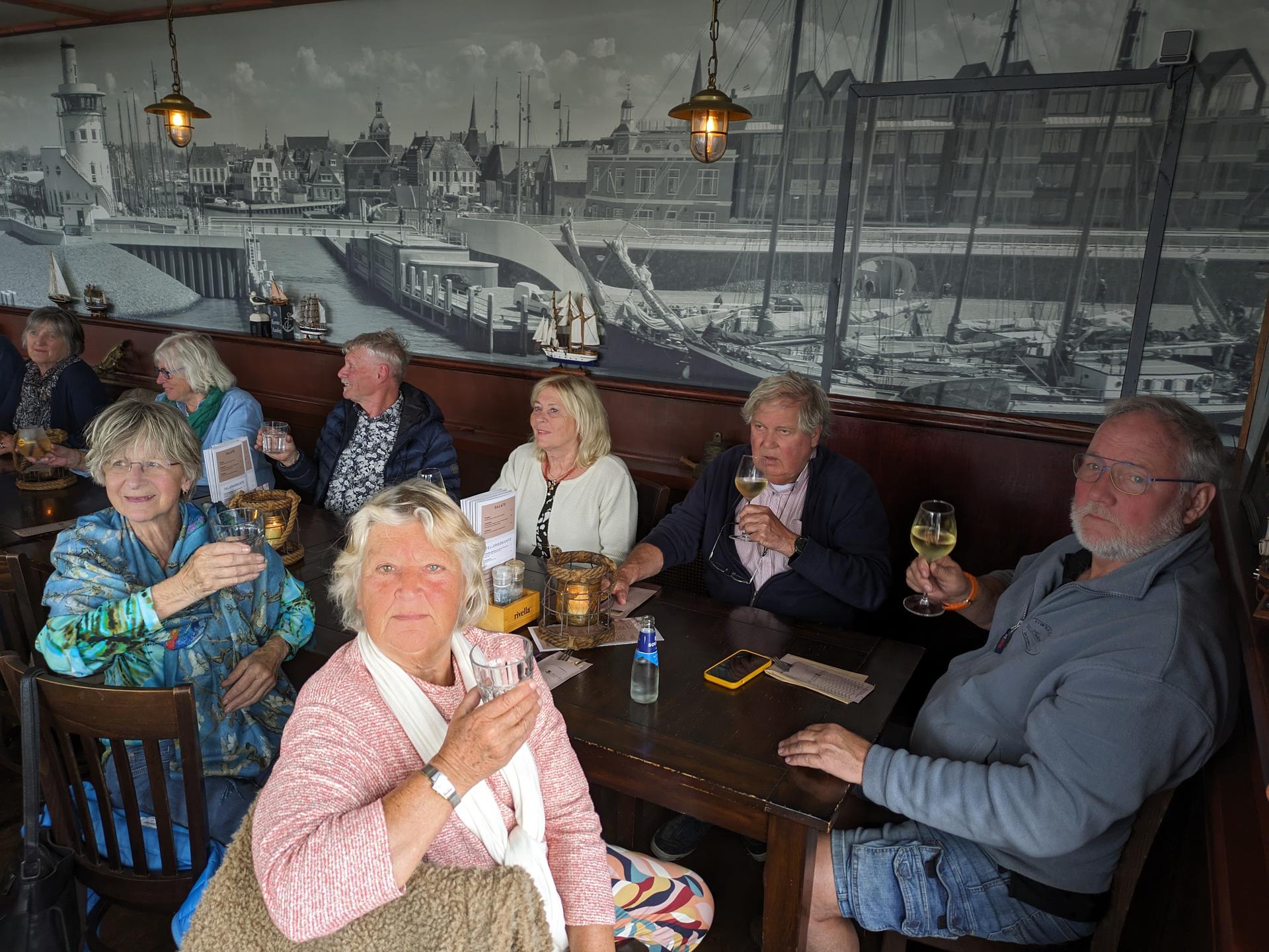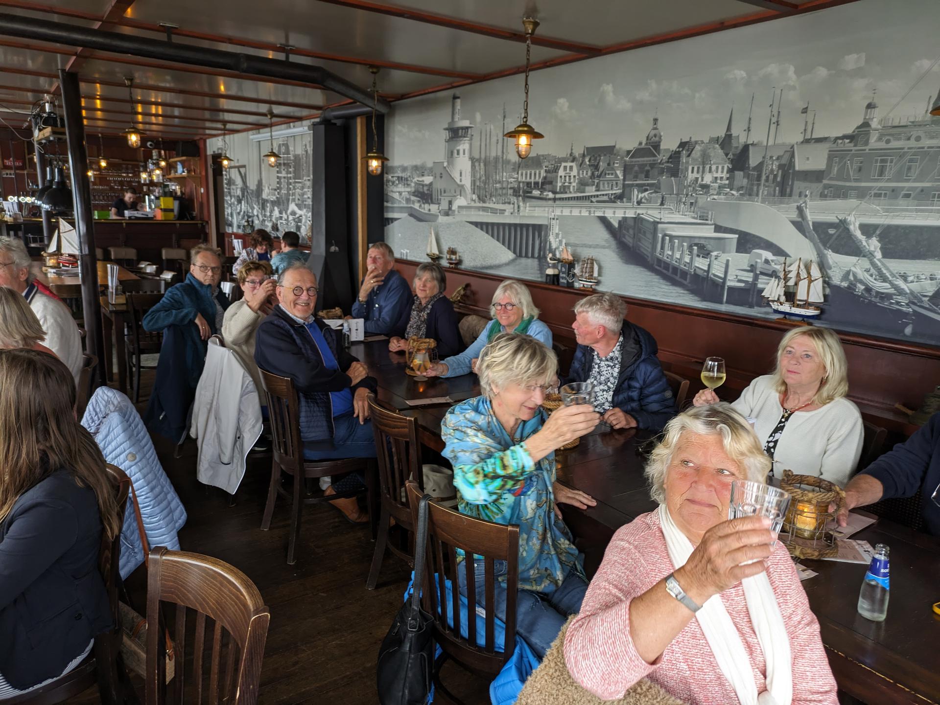 De drankjes smaakten en het eten erna net zo goed. Het wachten tussen de gangen werd verlicht door historie en anekdotes vanuit Oost-oprichter Benno en (al heel lang) lid Hans t.H. De avond was nog lang gezellig... Na een goede nacht slaap (en een paar baantjes in het zwembad voor sommigen) zaten we zondag op tijd aan het ontbijt met uitzicht op zee. Bij vertrek waren Mariëlle en ik nog niet genoeg uitgewaaid, dus wij zijn nog even naar Lange Jaap gelopen en hebben de Traction op de dijk gefotografeerd. Daardoor kwamen we pas bij Enkhuizen weer achterop bij de rest.