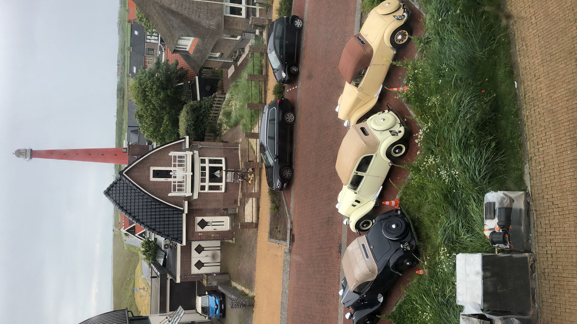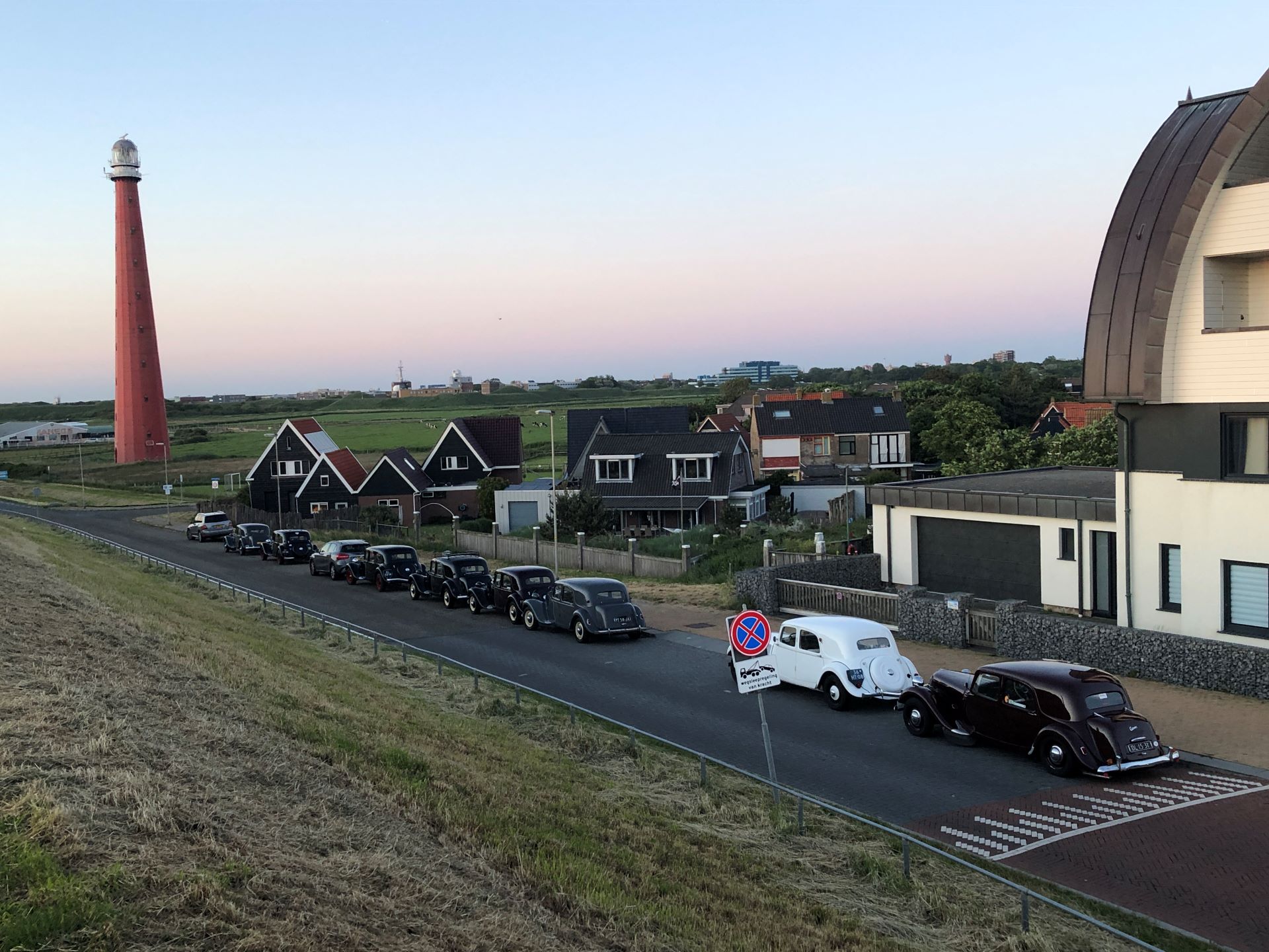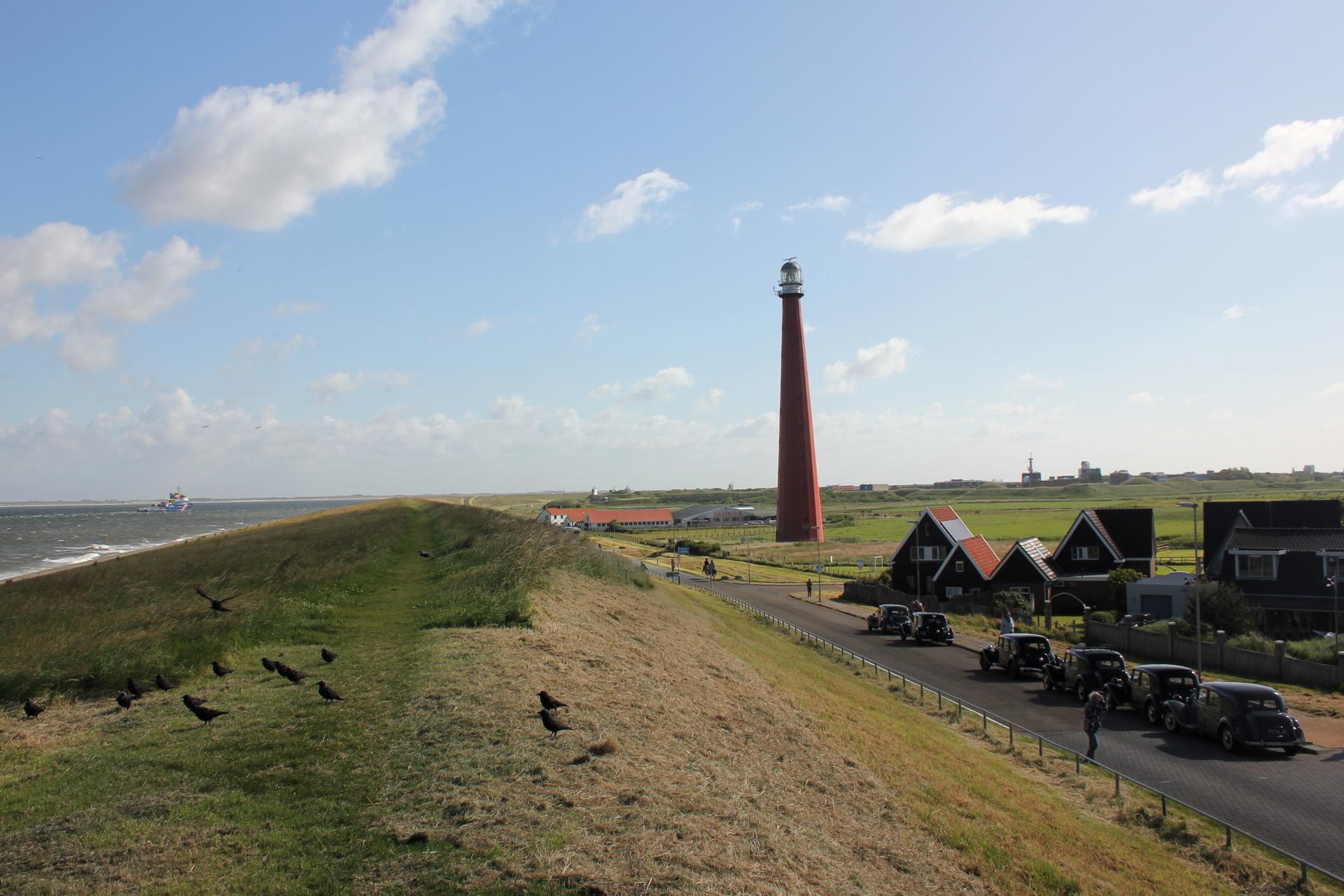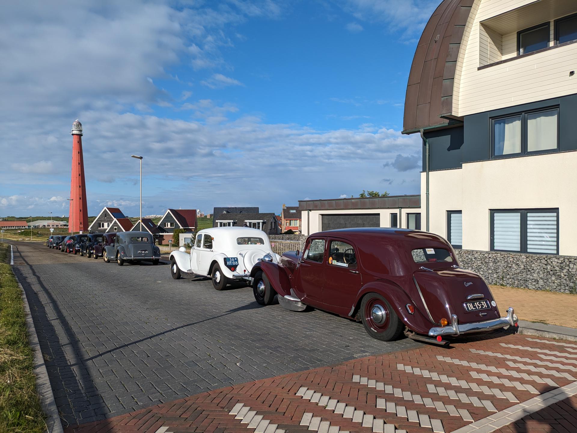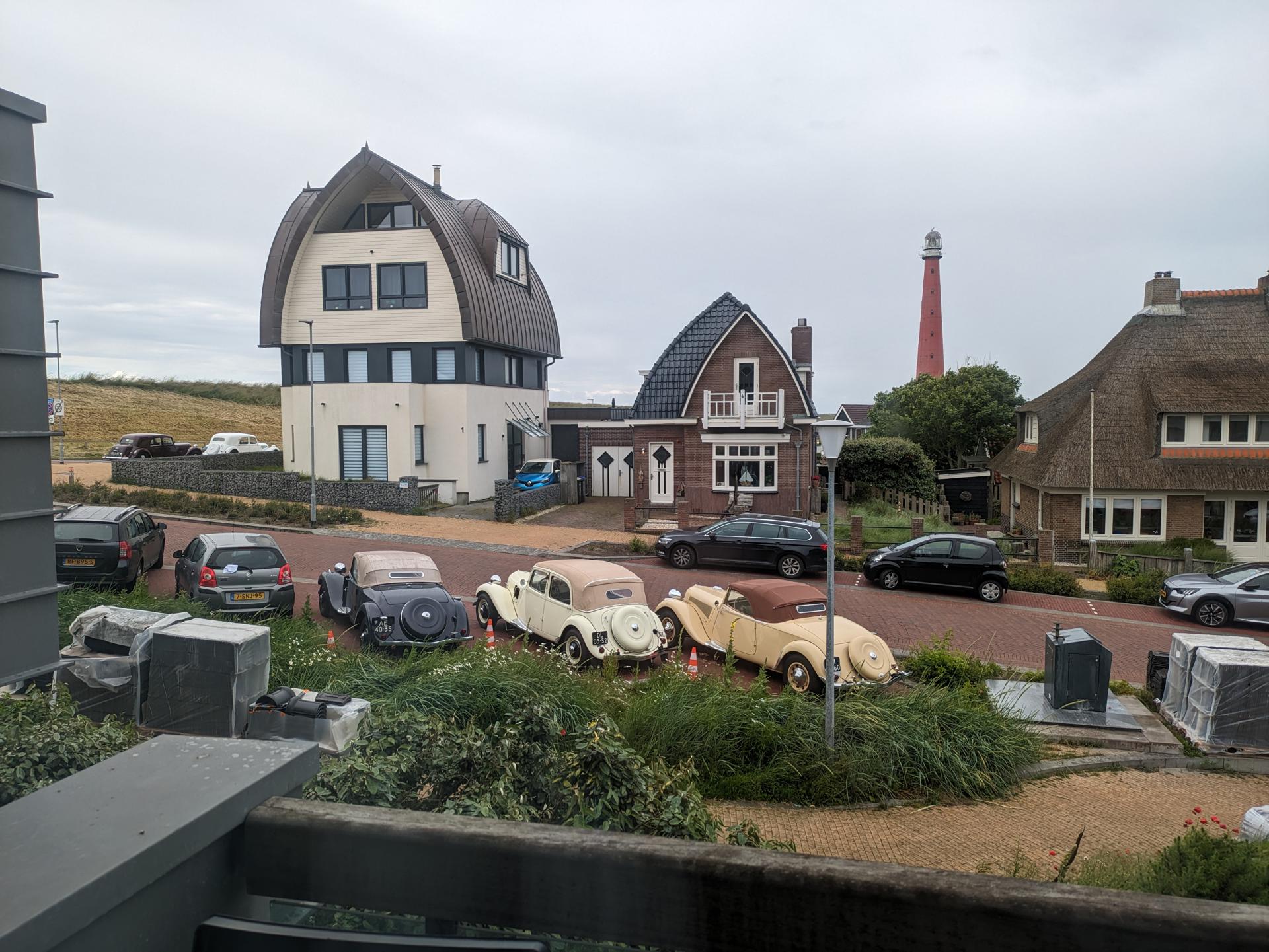 Toen het begon te druppen vertrokken de meesten verder. De route kon niet anders dan over de Afsluitdijk gaan. Niet de meest spannende weg, maar het blijft een bijzondere gewaarwording. Noord-Holland moesten we daarna ook oversteken, waarbij er steeds meer nattigheid uit de hemel viel. Door het wegvallen van het gereserveerde hotel moesten we namelijk uitwijken naar Huisduinen, helemaal bij Den Helder. Het was wel een mooie locatie: We parkeerden pal aan de Noordzeedijk, en de cabrio's kregen een eigen plekje voor de deur van het hotel van waaruit we ook de iconische gietijzeren vuurtoren Lange Jaap konden zien staan.
