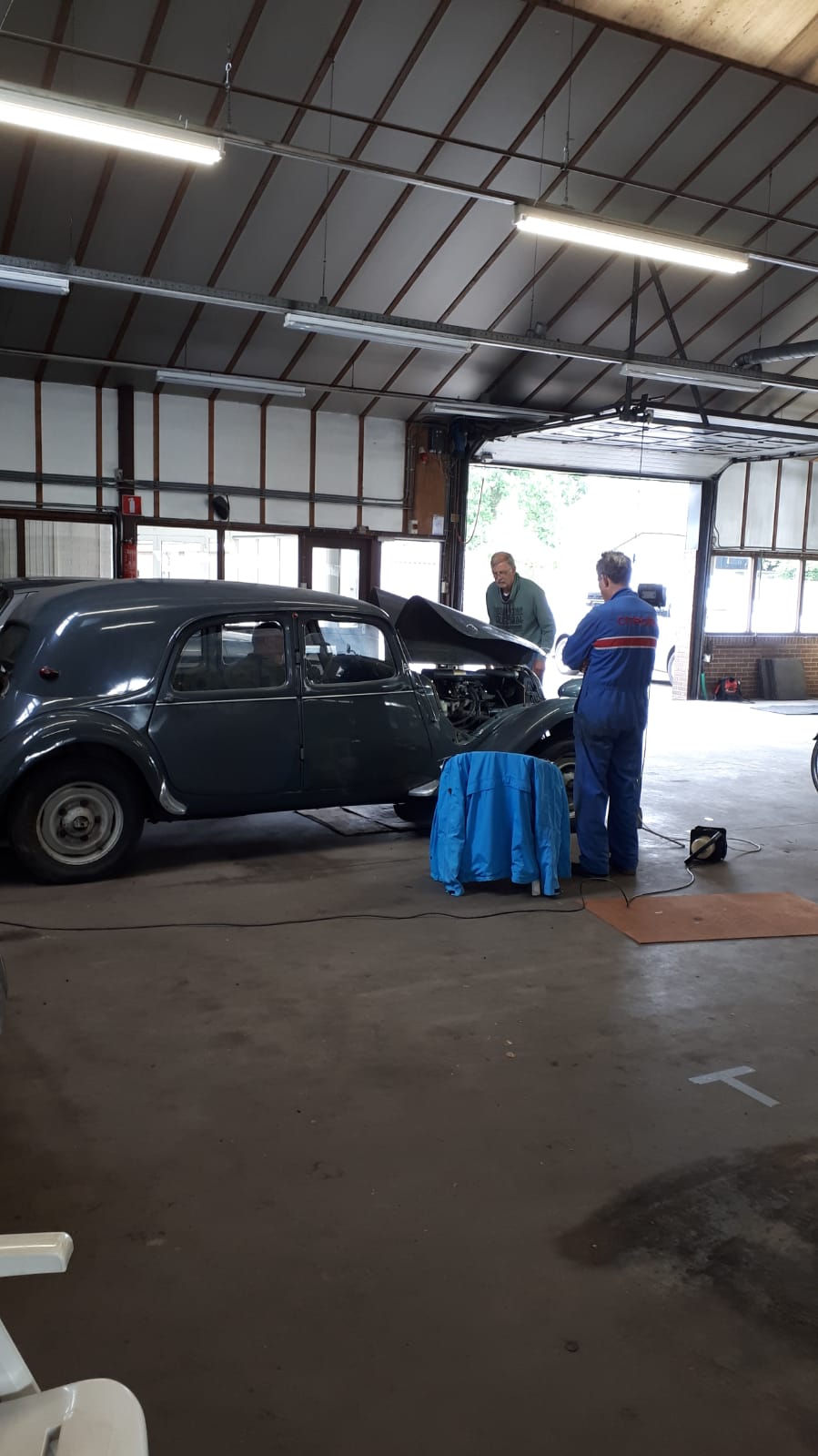 Bij onze aankomst werden we welkom geheten door Hans en Frans. Rie had de locatie nog niet gezien en keek vol bewondering rond. Even later kwam Rob om te sleutelen, hij moest de dynamo verwisselen, waarbij hij hulp kreeg van Hans ter Heijne. Frans was er met zijn Six om de wagenhoogte te corrigeren. Aan een kant zat het systeem loeivast, maar met vereende krachten van o.a. Hans is het allemaal gelukt. Op het laatst kwam Bob ook nog langs. Na een gezellig bakje koffie ging ieder huiswaarts.