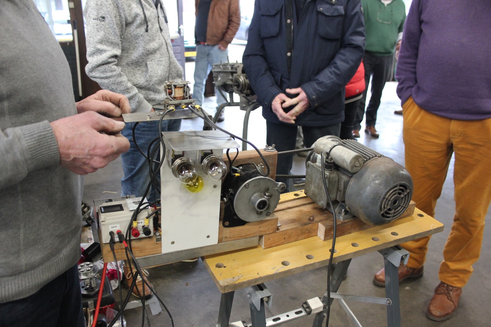 Vervolgens werd overgeschakeld naar de laboratoriumopstelling van een simulatie van de elektrische installatie van de Traction. Een elektromotor drijft hierbij de dynamo aan met een gemiddeld toerental. Vervolgens gaat de dynamo op gang komen door het aanwezige remanent magnetisme, en regelt de spanningsregelaar de spanning af op een waarde van rond de 7,3 volt, tevens wordt de maximale stroom afgeregeld. Nou ja, afregelen, het is meestal met 20 ampère wel op, meer levert de dynamo meestal niet.
