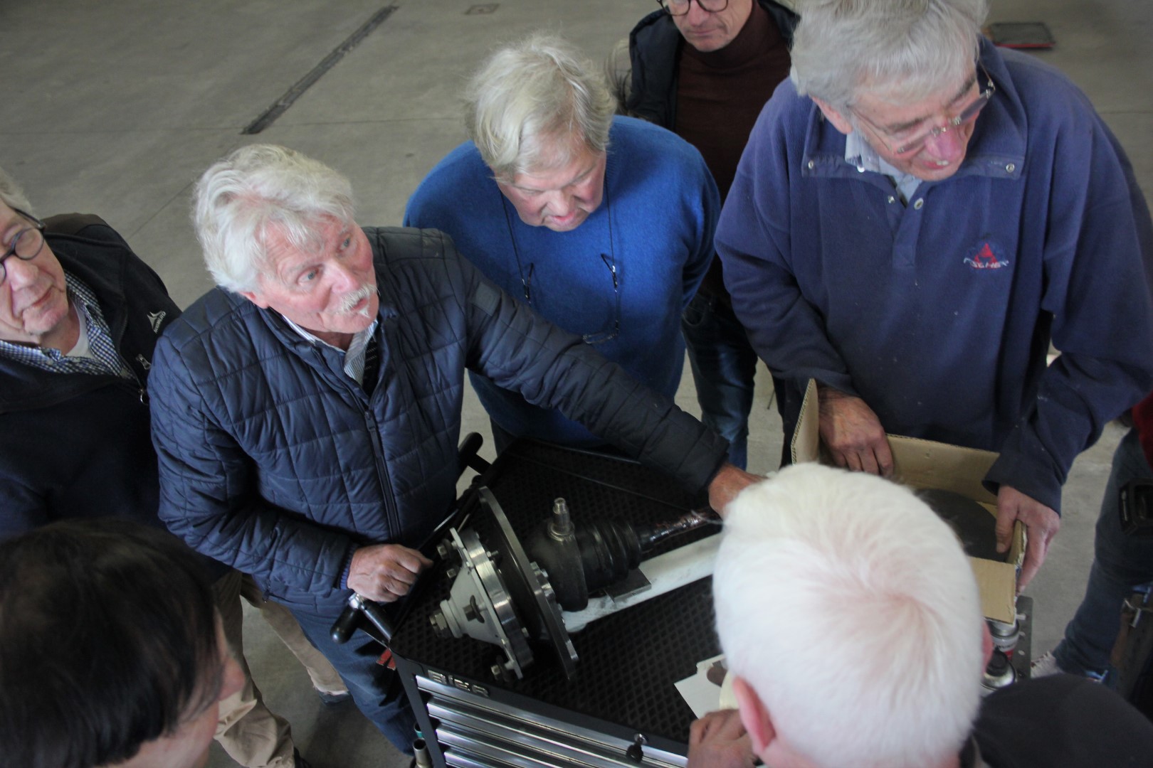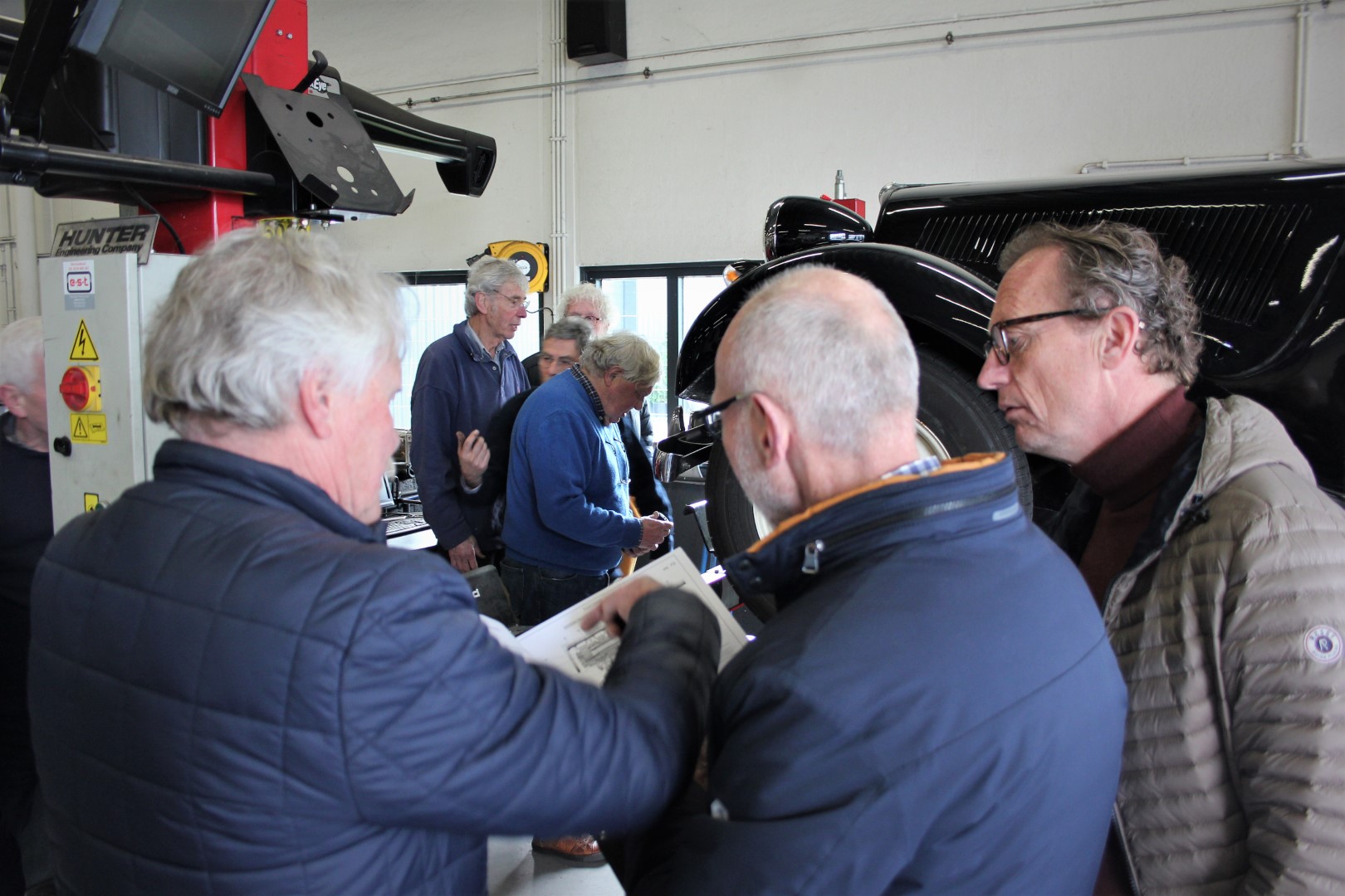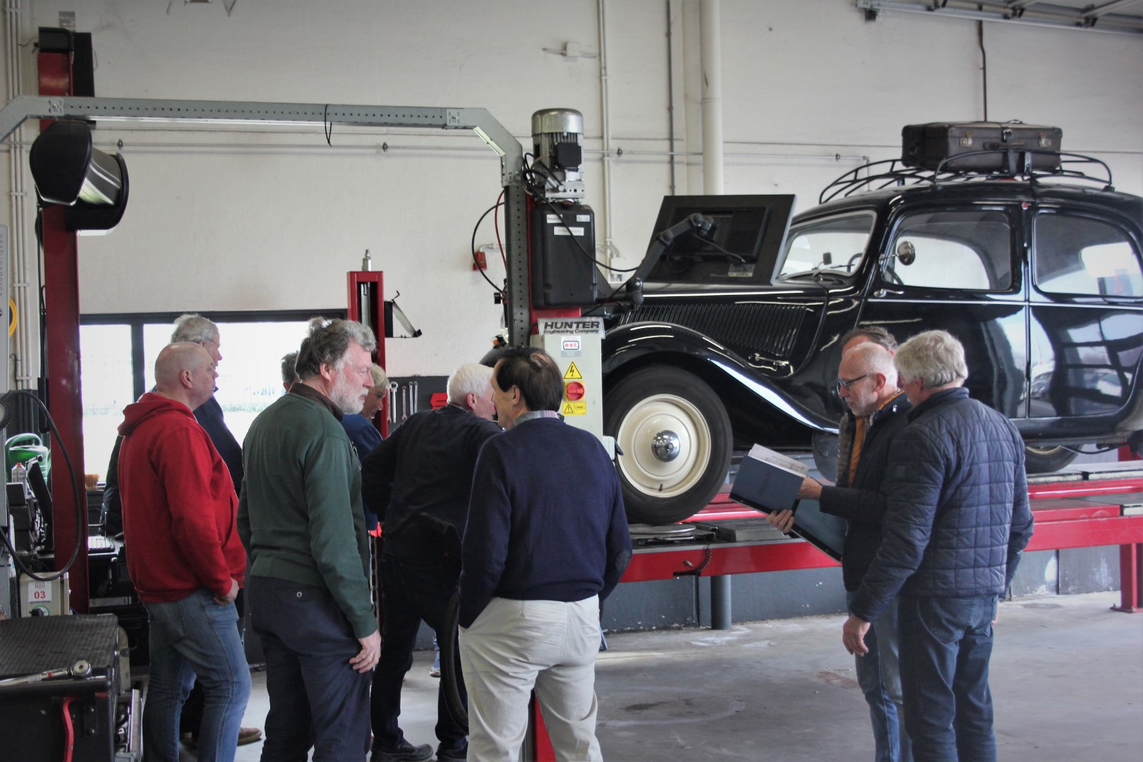 Toen de koffie op was trok het hele gezelschap richting werkplaats. Onder begeleiding van Hans ging de ene na de andere auto over de remmentestbank. Niet alleen de remkracht wordt daarmee gemeten, maar ook het verschil tussen links en rechts. Aangezien de remmen van de Traction in het moderne verkeer weinig reserve hebben, is het nuttig om dit zo goed mogelijk op orde te krijgen. Enkele leden gingen dan ook met wat huiswerk op pad. De auto van Niek werd ter plekke even bijgewerkt op de brug.