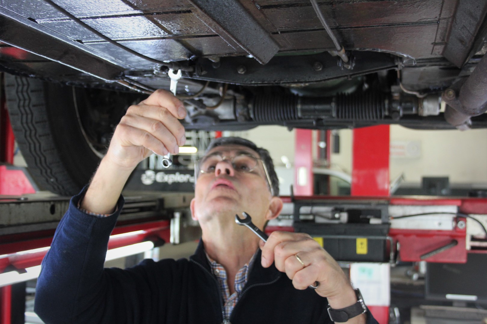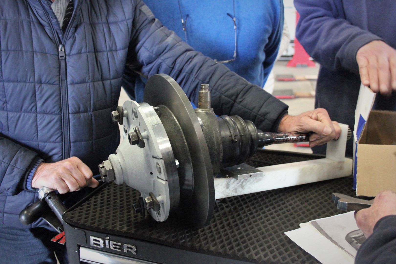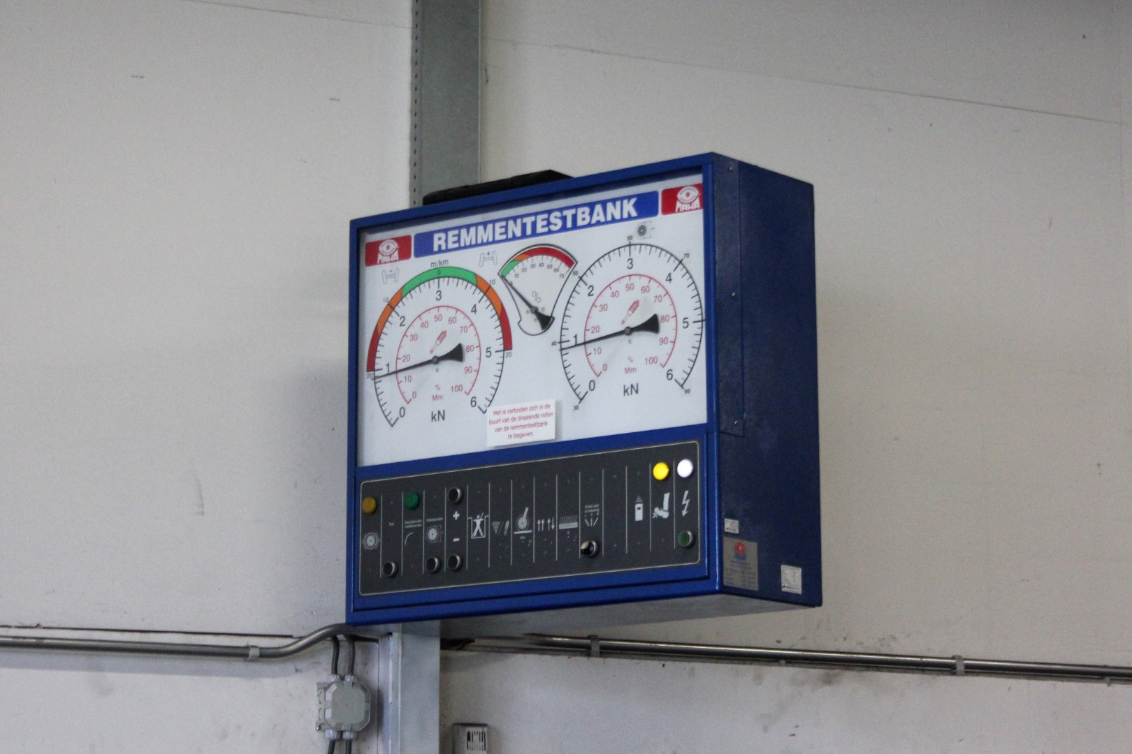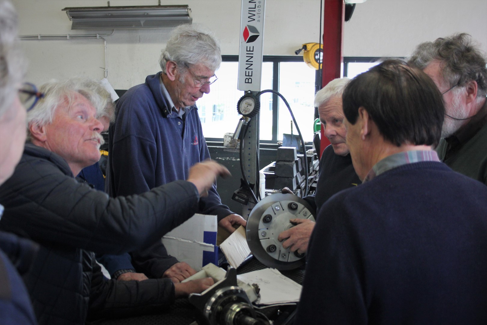 Toen de koffie op was trok het hele gezelschap richting werkplaats. Onder begeleiding van Hans ging de ene na de andere auto over de remmentestbank. Niet alleen de remkracht wordt daarmee gemeten, maar ook het verschil tussen links en rechts. Aangezien de remmen van de Traction in het moderne verkeer weinig reserve hebben, is het nuttig om dit zo goed mogelijk op orde te krijgen. Enkele leden gingen dan ook met wat huiswerk op pad. De auto van Niek werd ter plekke even bijgewerkt op de brug.