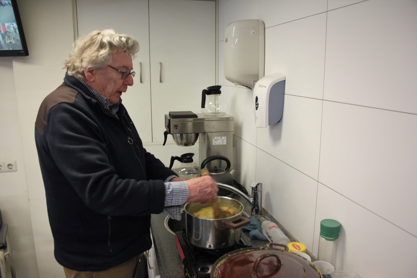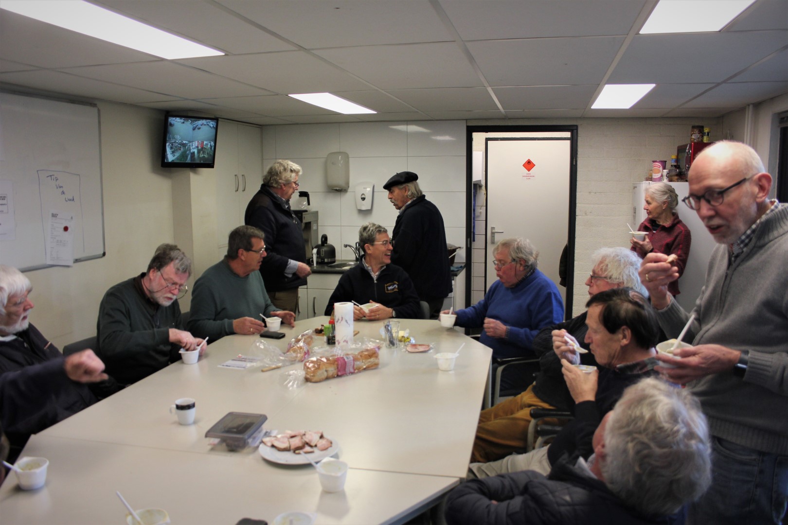 Niek had zich intussen teruggetrokken in de kantine met een grote pan een brander. Hij had zich op vrijdag uren werk verschaft door voor de hele club eigenhandig erwtensoep te maken. Na het klussen, praten en rondhangen waren de mannen hier wel aan toe. De snert was als vanouds heerlijk, Niek ontving hiervoor alle lof. Zo proberen we hem over te halen deze traditie voort te zetten.