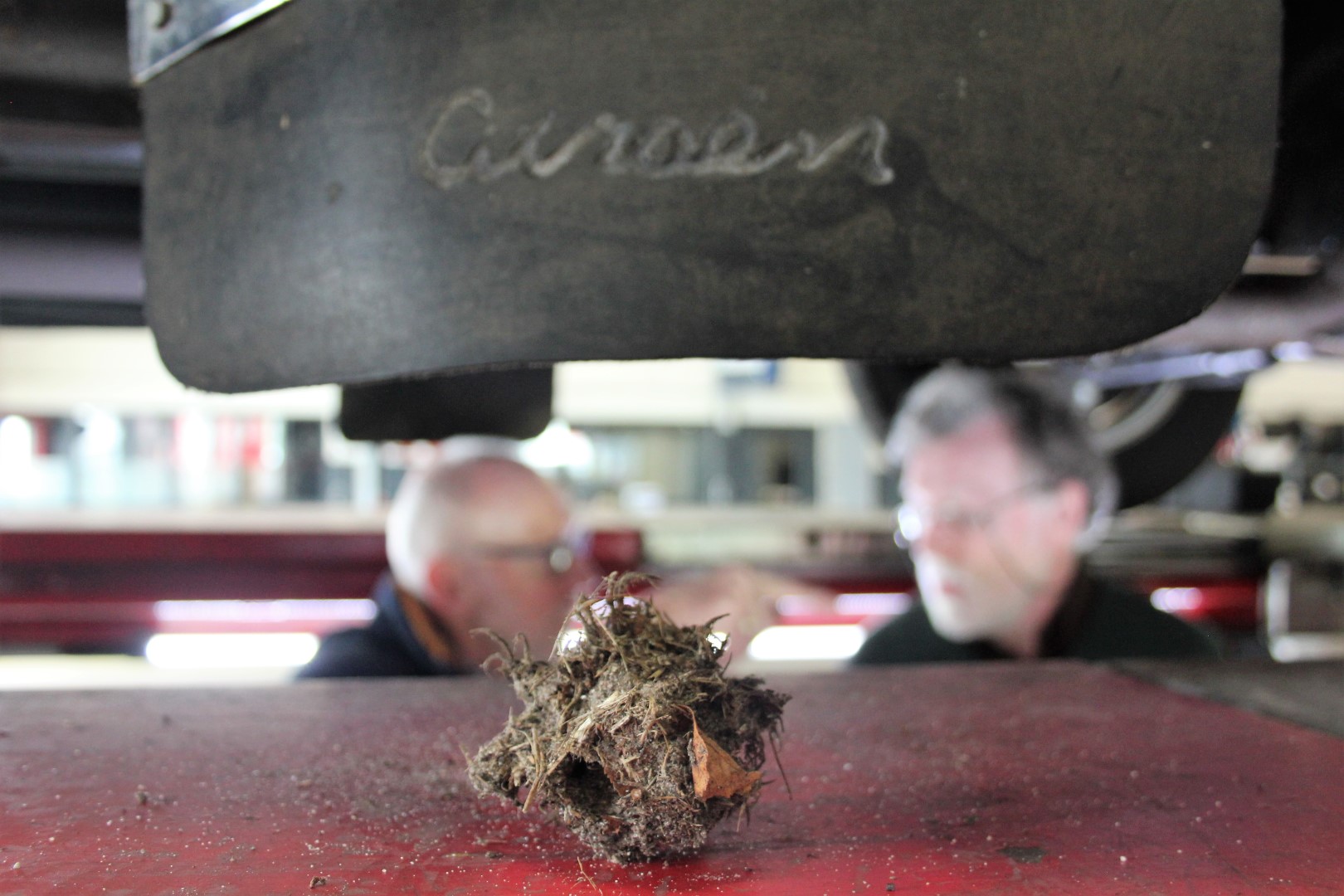 De Traction van Jules ging ook de brug op, hij had zijn auto nog nooit goed van onderen kunnen bekijken. Daar bleek nog wat werk te zitten, de hele onderzijde bleek namelijk flink nat van de olie. Ook Freek was op zoek naar een (iets minder heftige) olielekkage op de brug. Het leek er toch op dat dit bij de krukaskeerring vandaan komt, ondanks de verbeterde versie die hij heeft ingebouwd. Er schijnen inmiddels nóg verder verbeterde krukaskeerringen te zijn die wel iets beter werken. Wellicht iets voor de volgende keer dat de motor uit de auto gaat, Freek begint er handig in te worden na dit een aantal keren gedaan te hebben de afgelopen jaren. Frans kon zich niet inhouden toen hij een los hangende handremkabel zag, en leefde zich uit met een enorme lading sleutels die allemaal de verkeerde maat leken te hebben. Uiteindelijk lukte het dan toch.