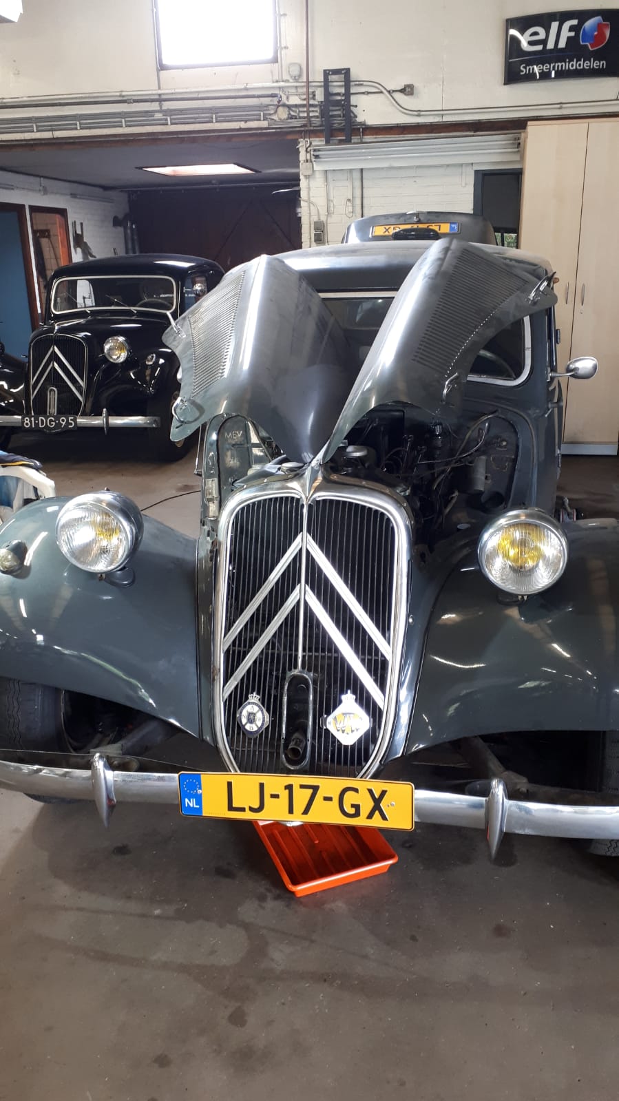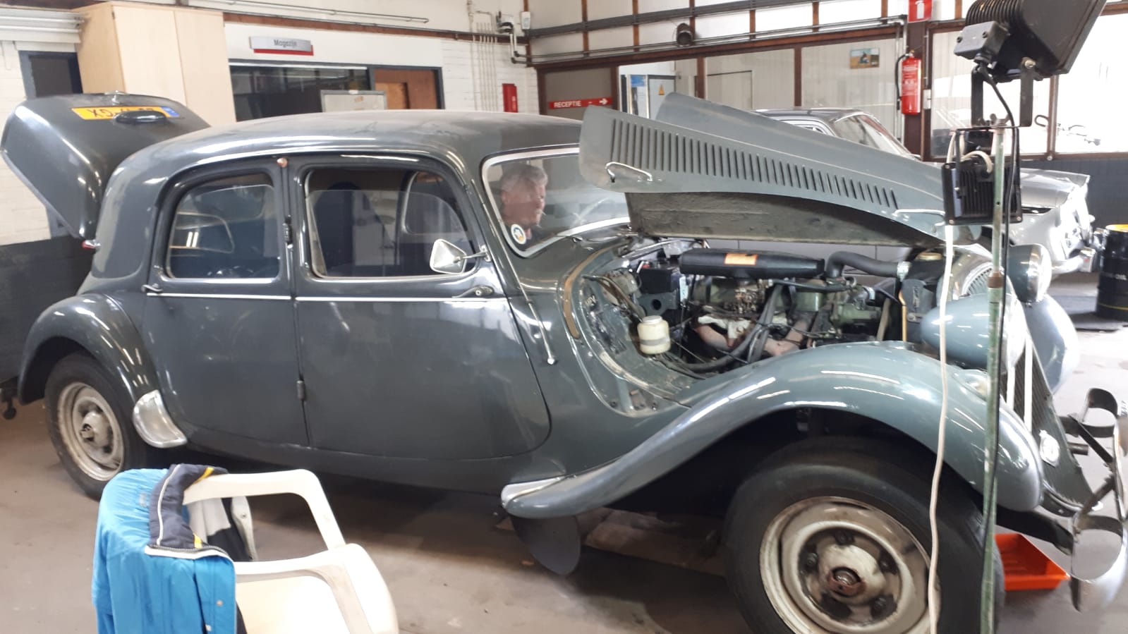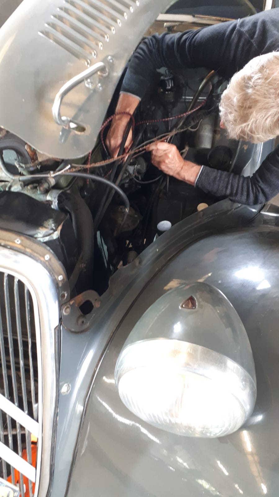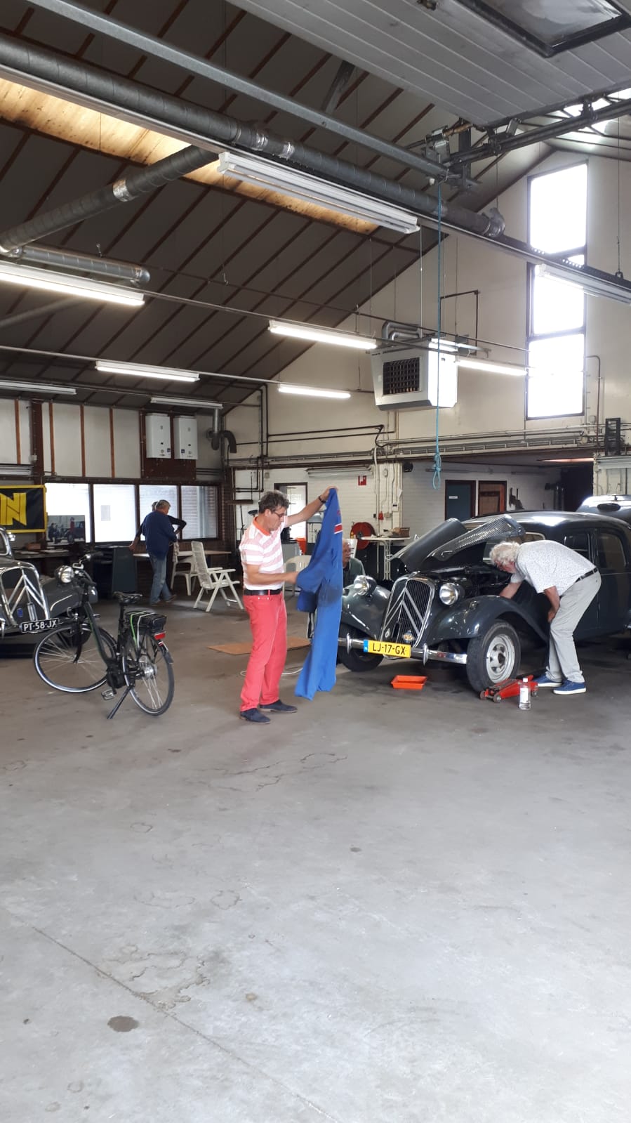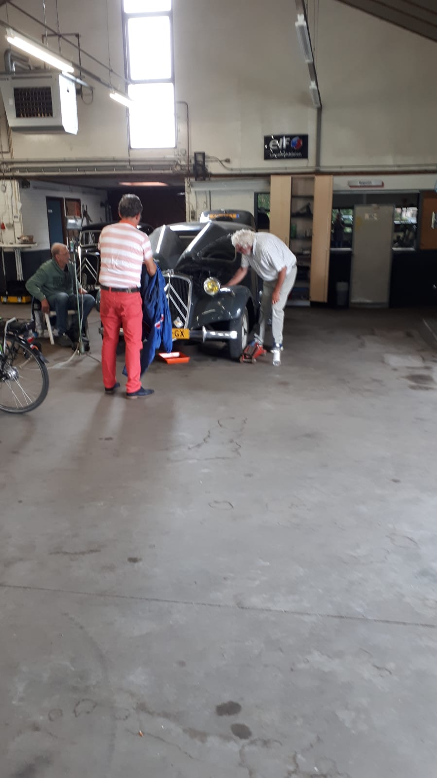 Bij onze aankomst werden we welkom geheten door Hans en Frans. Rie had de locatie nog niet gezien en keek vol bewondering rond. Even later kwam Rob om te sleutelen, hij moest de dynamo verwisselen, waarbij hij hulp kreeg van Hans ter Heijne. Frans was er met zijn Six om de wagenhoogte te corrigeren. Aan een kant zat het systeem loeivast, maar met vereende krachten van o.a. Hans is het allemaal gelukt. Op het laatst kwam Bob ook nog langs. Na een gezellig bakje koffie ging ieder huiswaarts.