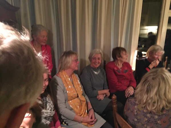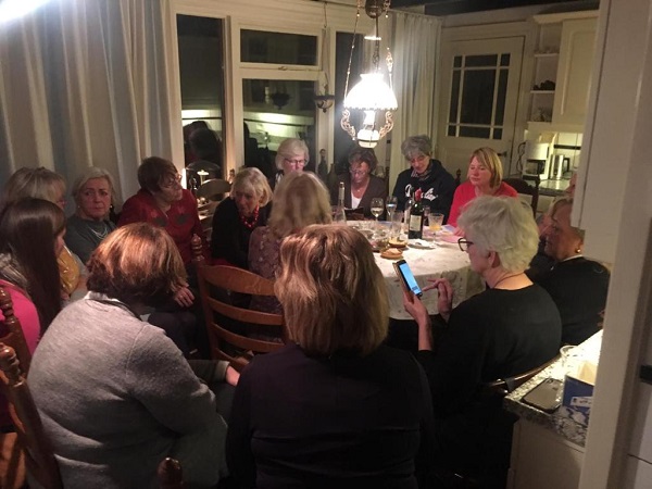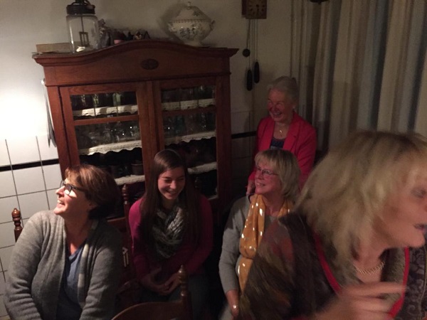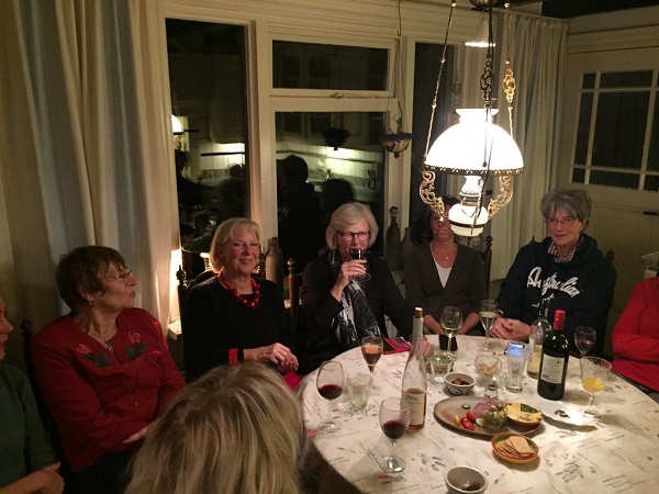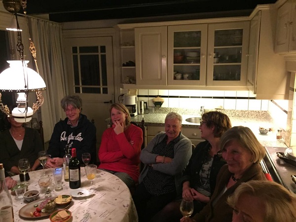 Al snel hadden de dames de keuken tot hun domein gemaakt; niet om te koken maar om de mannen één voor één “door te nemen”. Ook hadden zij de wijnflessen al snel gevonden!