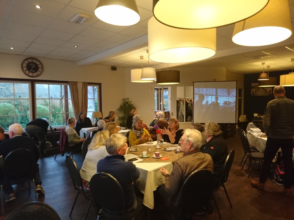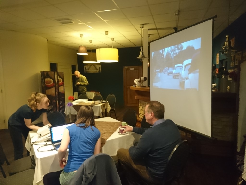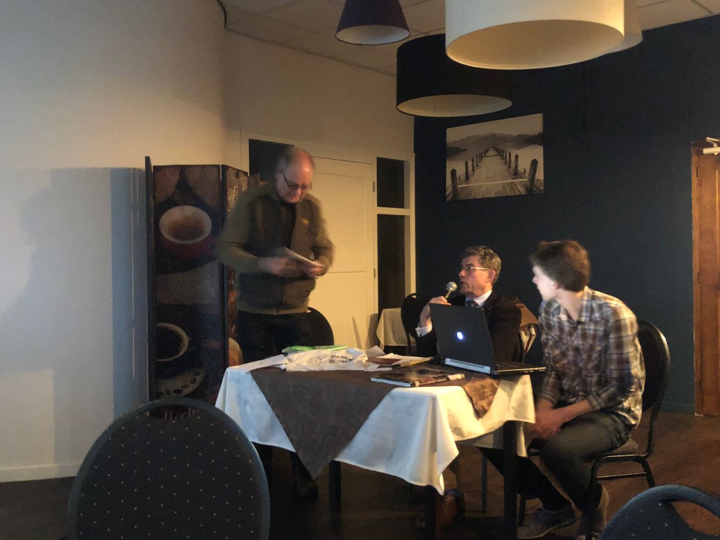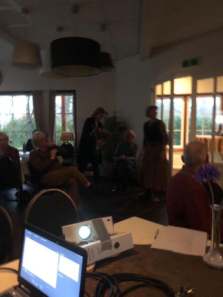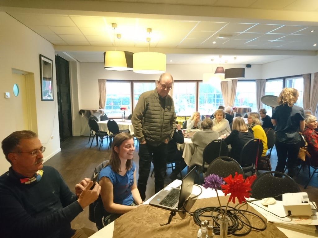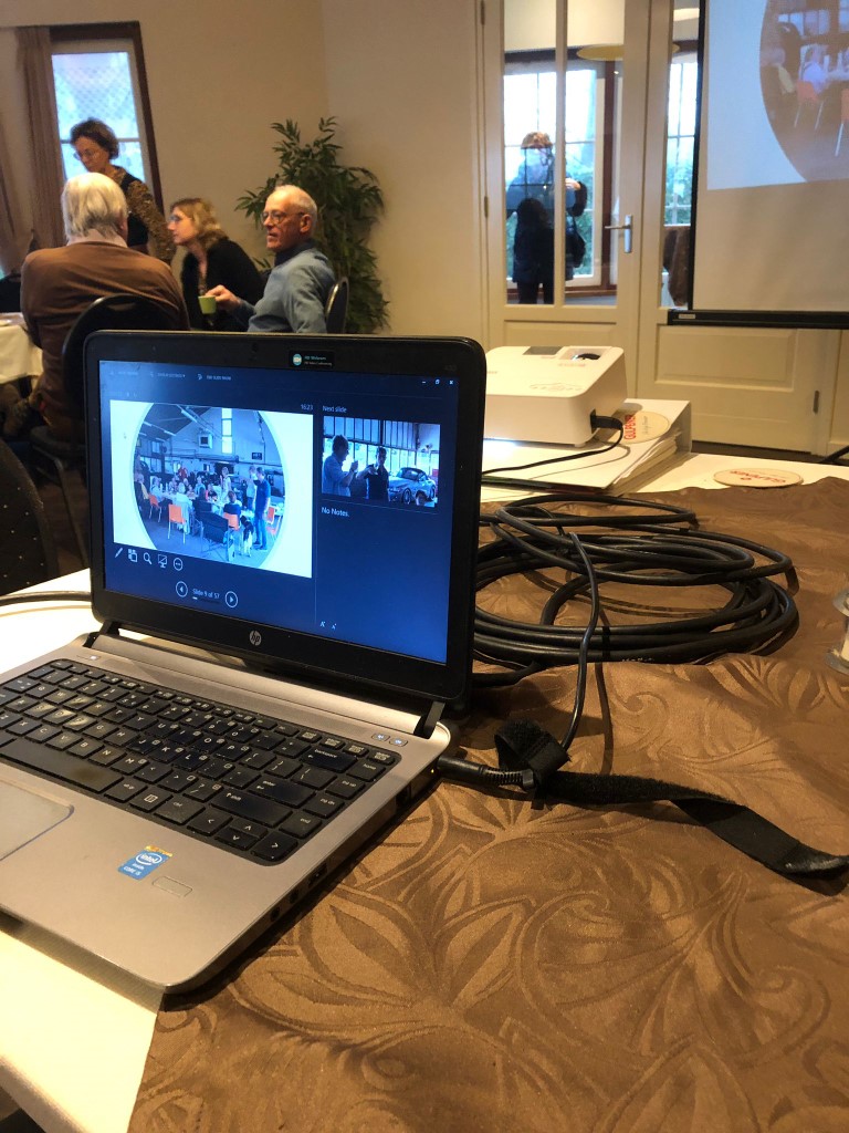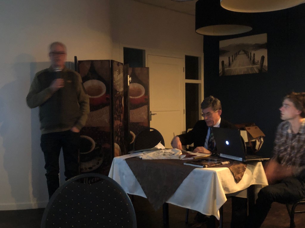 We begonnen zodoende binnen, met een kop warme koffie of thee. Terwijl de Oost-leden binnendruppelden probeerde het bestuur de vergadering voor te bereiden. Dat Frans de beamer had achtergelaten in de Traction, terwijl hij met zijn moderne blik was gekomen, was een extra hindernis. Gelukkig had restaurant De Nieuw Brug nog een beamer liggen. Alleen de kabel moest van ver komen, zo lang was hij al niet meer gebruikt.