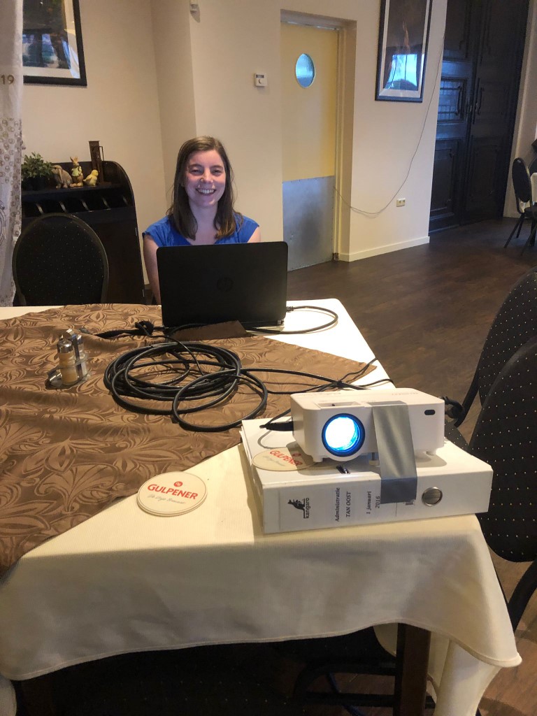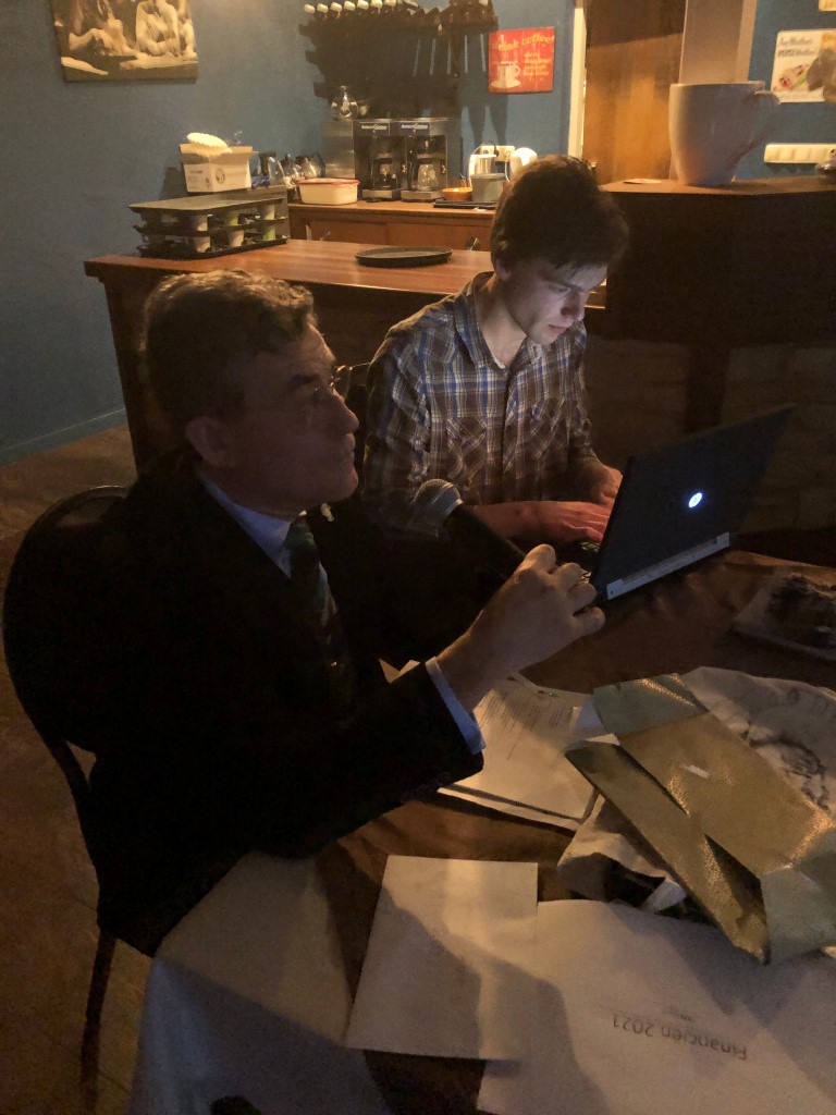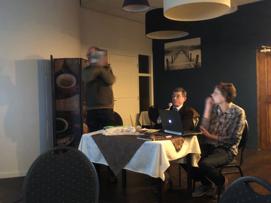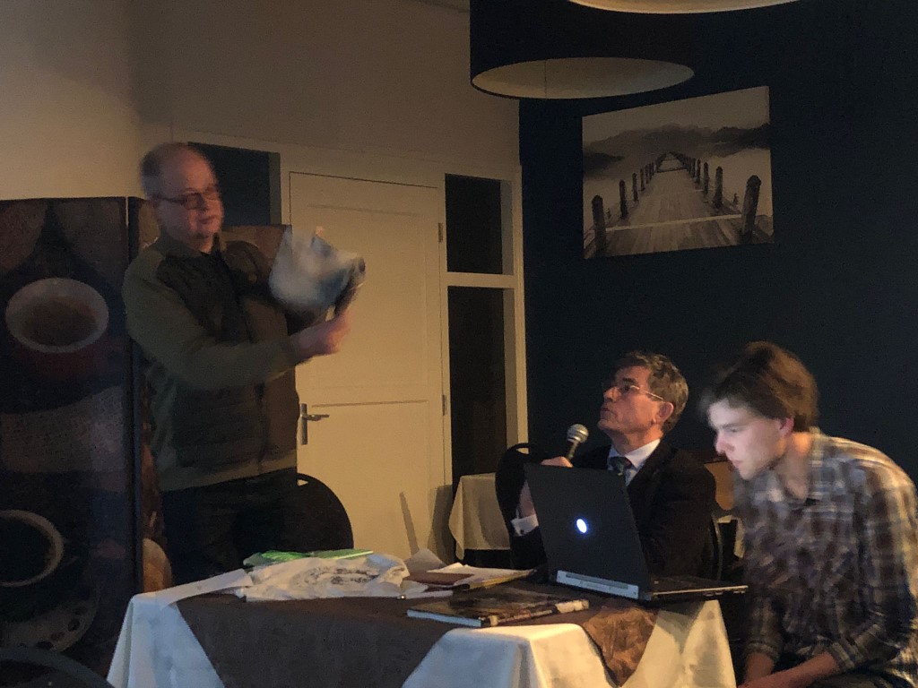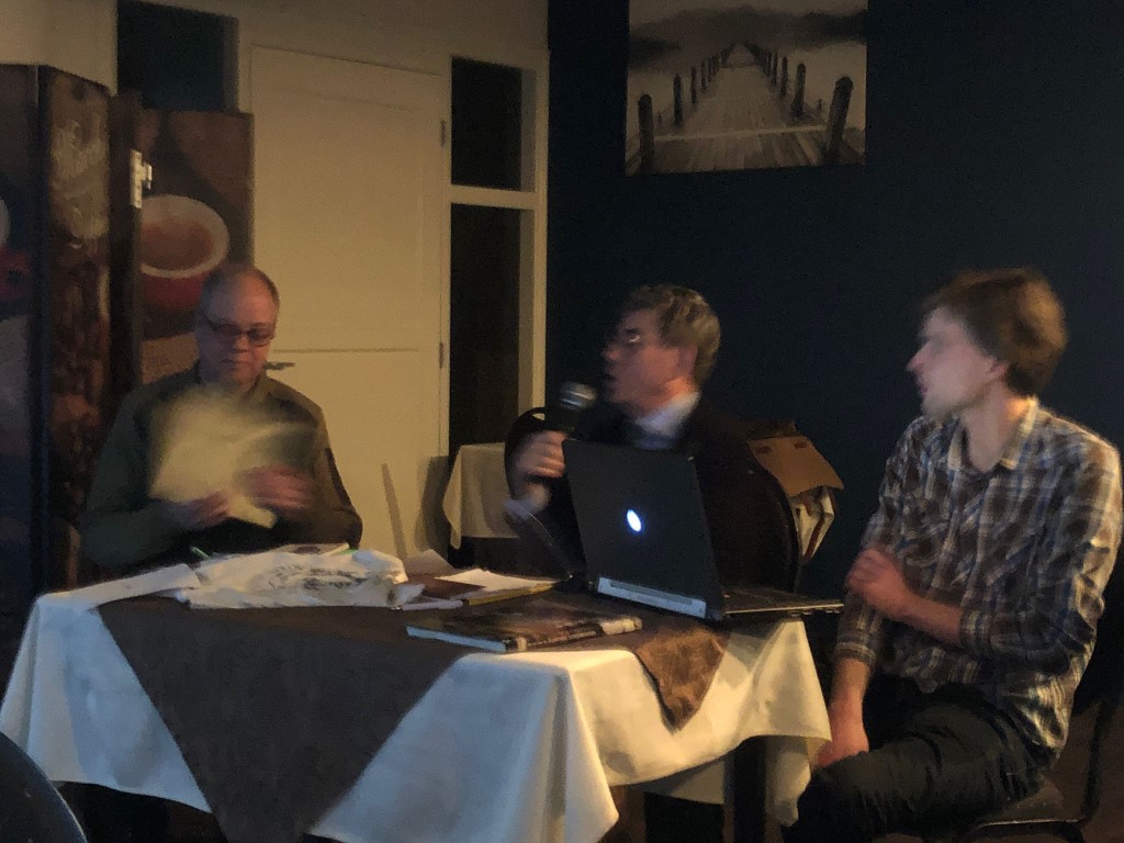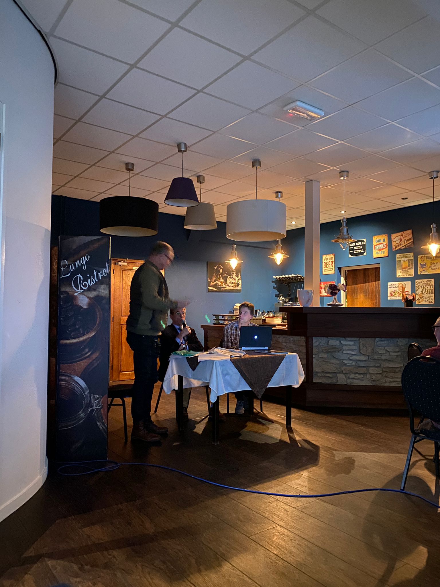 We begonnen zodoende binnen, met een kop warme koffie of thee. Terwijl de Oost-leden binnendruppelden probeerde het bestuur de vergadering voor te bereiden. Dat Frans de beamer had achtergelaten in de Traction, terwijl hij met zijn moderne blik was gekomen, was een extra hindernis. Gelukkig had restaurant De Nieuw Brug nog een beamer liggen. Alleen de kabel moest van ver komen, zo lang was hij al niet meer gebruikt.