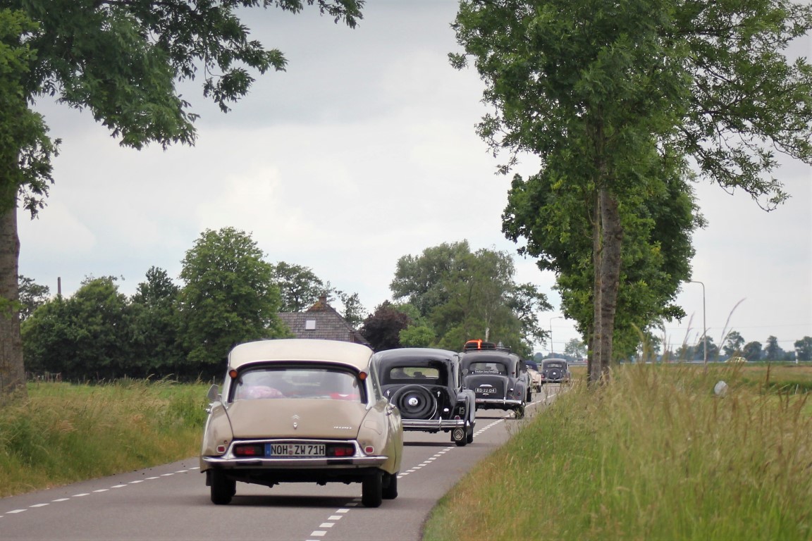 Maarten en Rie reden de route voorop, hoewel iedereen van een routebeschrijving was voorzien om verdwalen te voorkomen. Met een prachtige route via Nieuwleusen, Genne, Holten (die andere), Zwartsluis en natuurgebied De Wieden-Weerribben kwamen we bij de culturele tussenstop in Wanneperveen. Daar had ons lid Tony M. ons uitgenodigd bij zijn monumentale boerderij. Hij stond ons met zijn vrouw Diana op te wachten om ons een parkeerplek te wijzen. Genoeg ruimte op het perceel, de aankleding met al die Tractions en Tony’s eigen DS’en was bijzonder sfeervol.