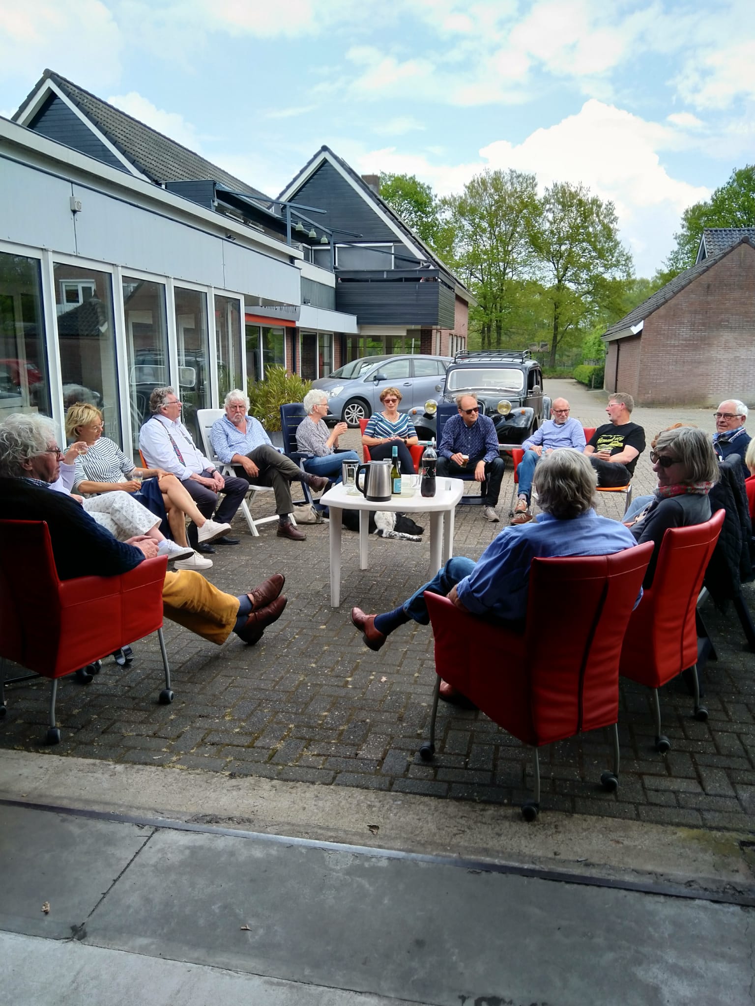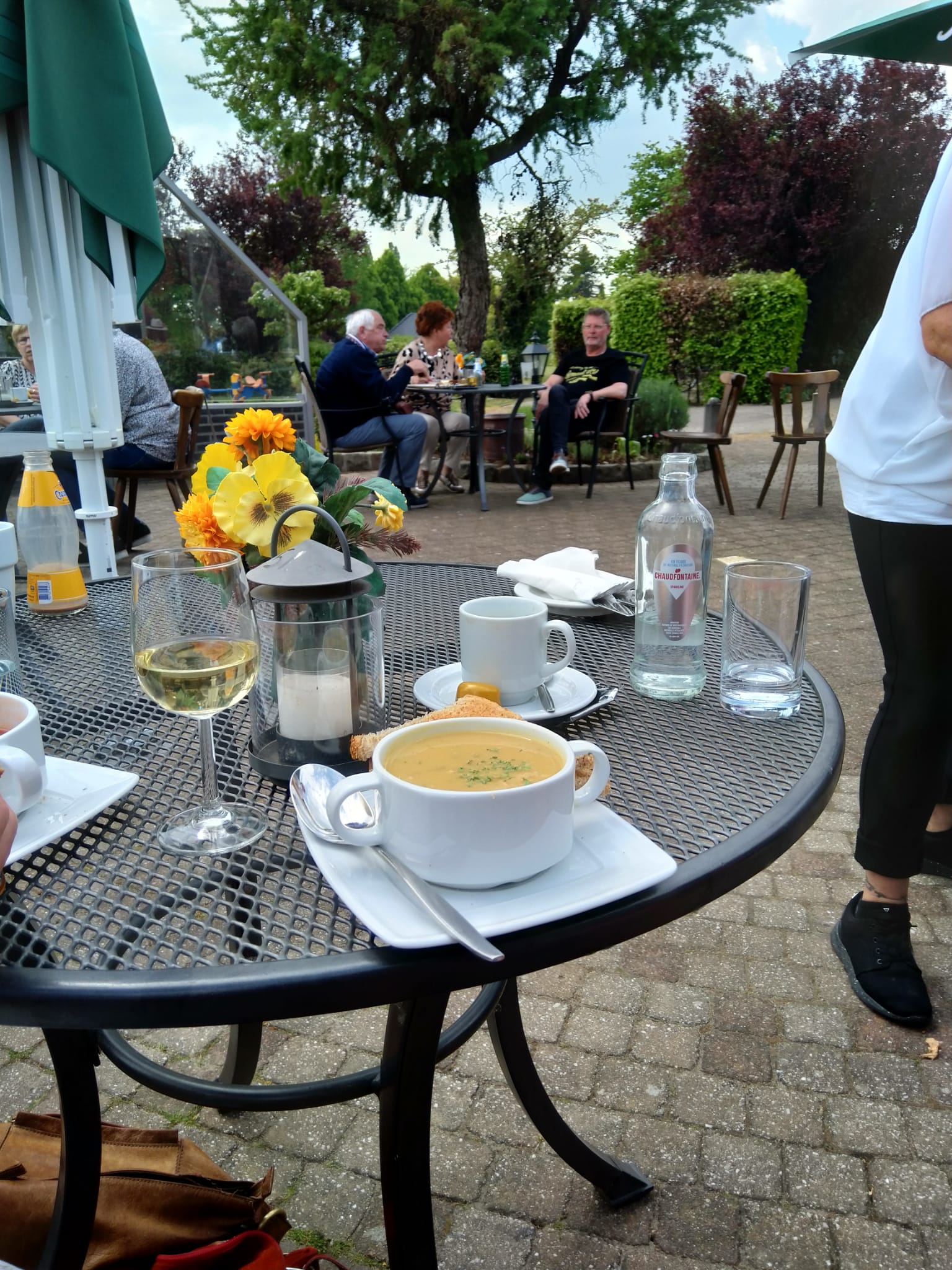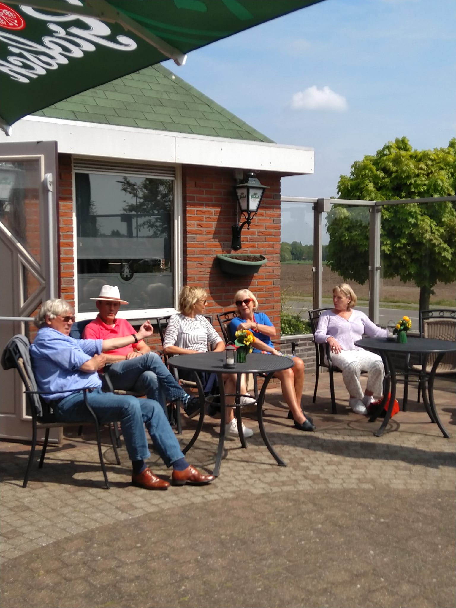 Daar werd gepauzeerd op het terras in de stralende zon. Door de blijkbaar verraste waard, waardin en hun dochter werden uiteindelijk diverse drankjes, omeletten en soepen geserveerd. De laatste met een ongelooflijke hoeveelheid champignons of met meer balletjes dan tomaten! Aardige mensen, die Achterhoekers!