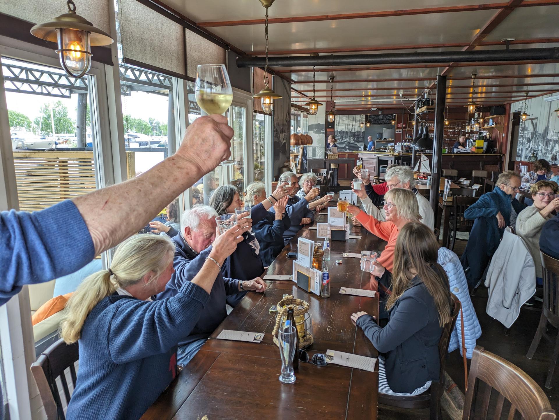 Daar wilden we koffie drinken, maar er bleken moeilijkheden te zijn met de gekozen locatie. Helaas was ook het alternatief halverwege de dijk Enkhuizen-Lelystad gesloten, waarna we maar besloten door te rijden naar de lunch in Elburg. Enkelen verkozen het om diverse redenen om door te rijden naar huis, maar een flink groepje heeft op het terras in Elburg van taart of lunch genoten. Elburg is trouwens echt een mooie vestingstad, met bijzondere elementen zoals de smalle muurhuisjes. Vanuit Elburg reden de meesten via de pont (die bij Wijhe was al uit de vaart genomen en die in Olst kon nog net aanleggen, het water stond bijna te hoog) weer terug naar Overijssel. Het was leuk om eens een weekend met elkaar op te trekken.