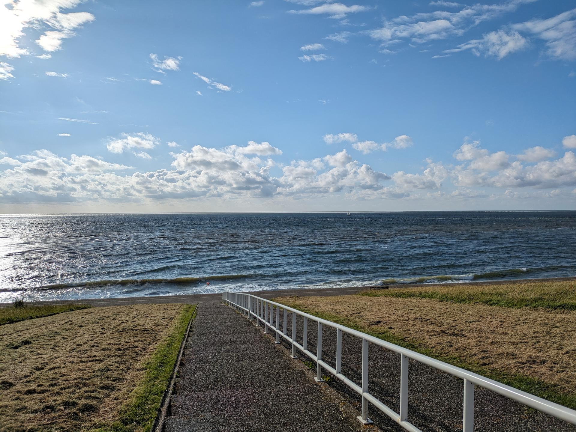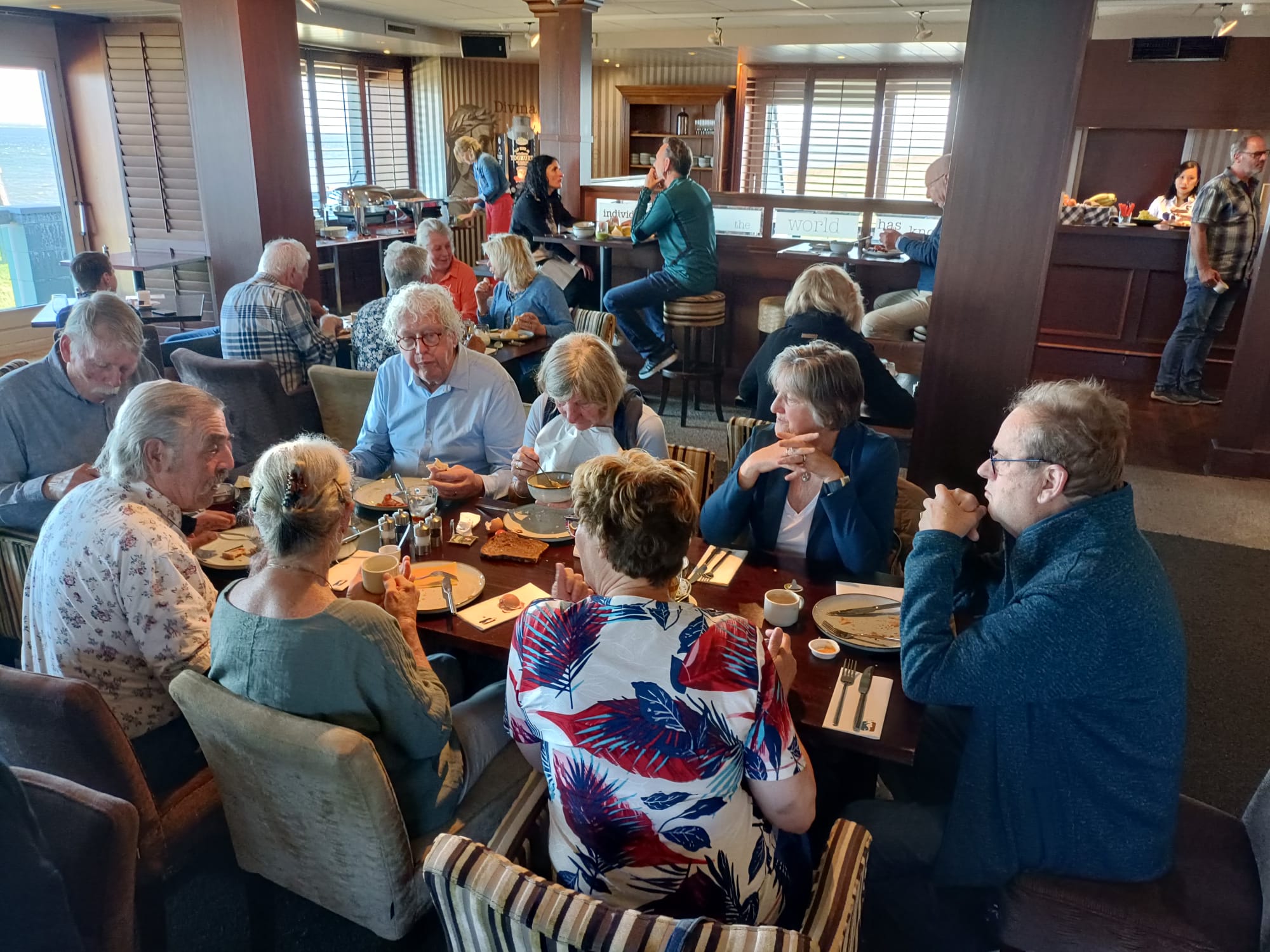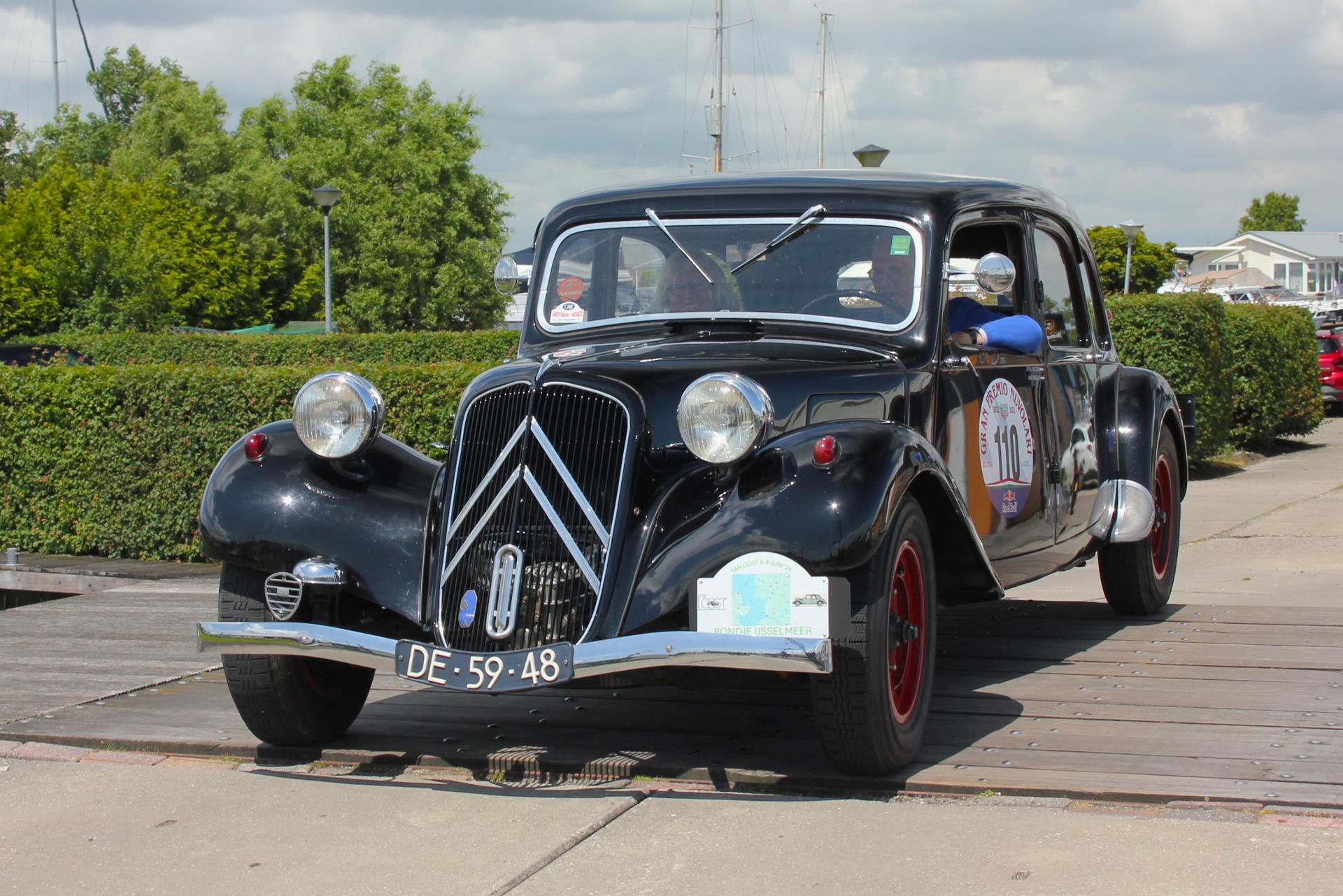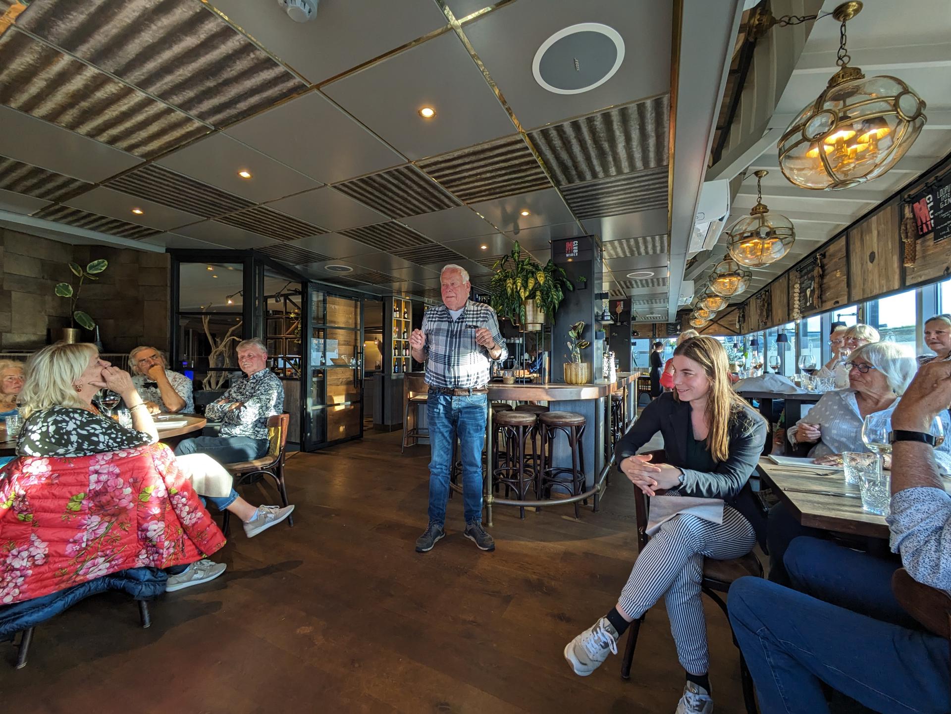 De drankjes smaakten en het eten erna net zo goed. Het wachten tussen de gangen werd verlicht door historie en anekdotes vanuit Oost-oprichter Benno en (al heel lang) lid Hans t.H. De avond was nog lang gezellig... Na een goede nacht slaap (en een paar baantjes in het zwembad voor sommigen) zaten we zondag op tijd aan het ontbijt met uitzicht op zee. Bij vertrek waren Mariëlle en ik nog niet genoeg uitgewaaid, dus wij zijn nog even naar Lange Jaap gelopen en hebben de Traction op de dijk gefotografeerd. Daardoor kwamen we pas bij Enkhuizen weer achterop bij de rest.