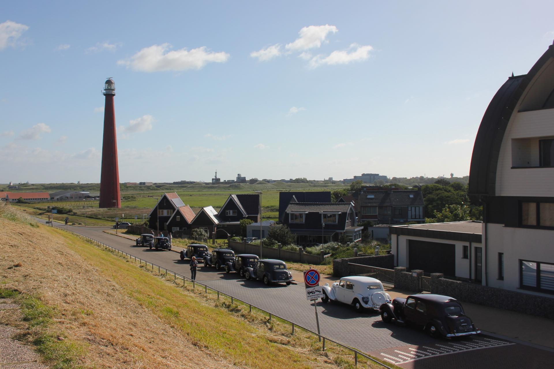 Toen het begon te druppen vertrokken de meesten verder. De route kon niet anders dan over de Afsluitdijk gaan. Niet de meest spannende weg, maar het blijft een bijzondere gewaarwording. Noord-Holland moesten we daarna ook oversteken, waarbij er steeds meer nattigheid uit de hemel viel. Door het wegvallen van het gereserveerde hotel moesten we namelijk uitwijken naar Huisduinen, helemaal bij Den Helder. Het was wel een mooie locatie: We parkeerden pal aan de Noordzeedijk, en de cabrio's kregen een eigen plekje voor de deur van het hotel van waaruit we ook de iconische gietijzeren vuurtoren Lange Jaap konden zien staan.
