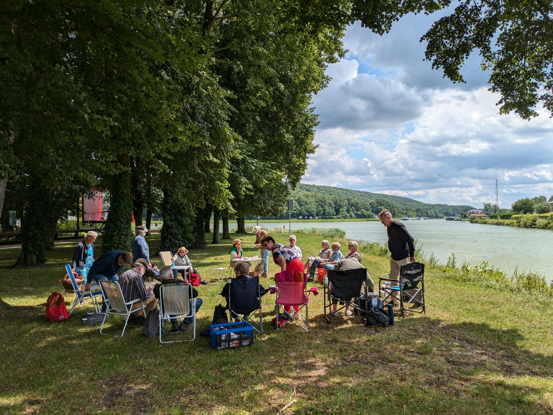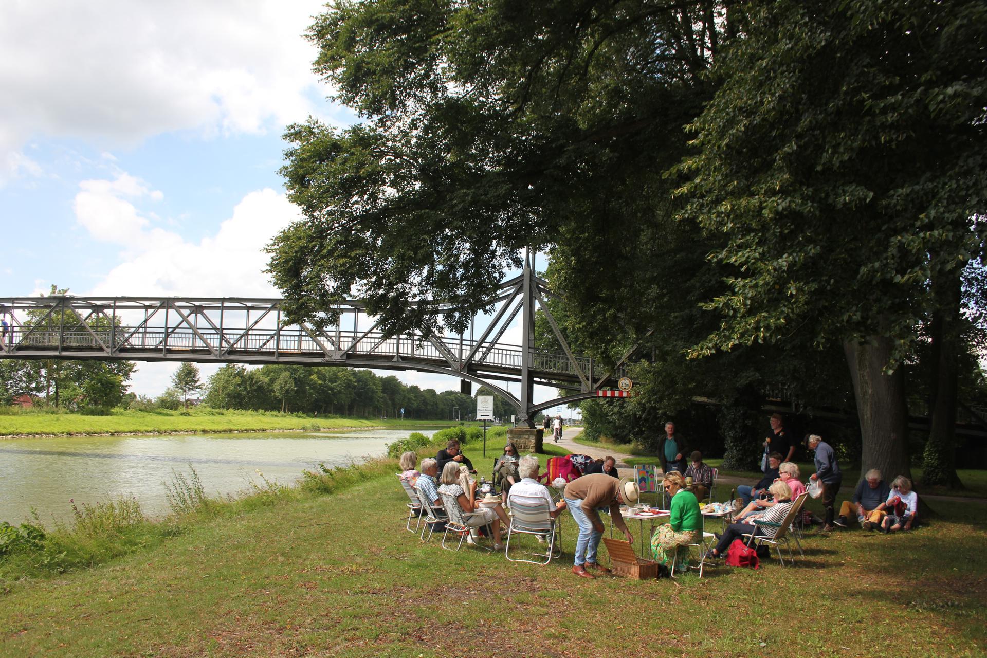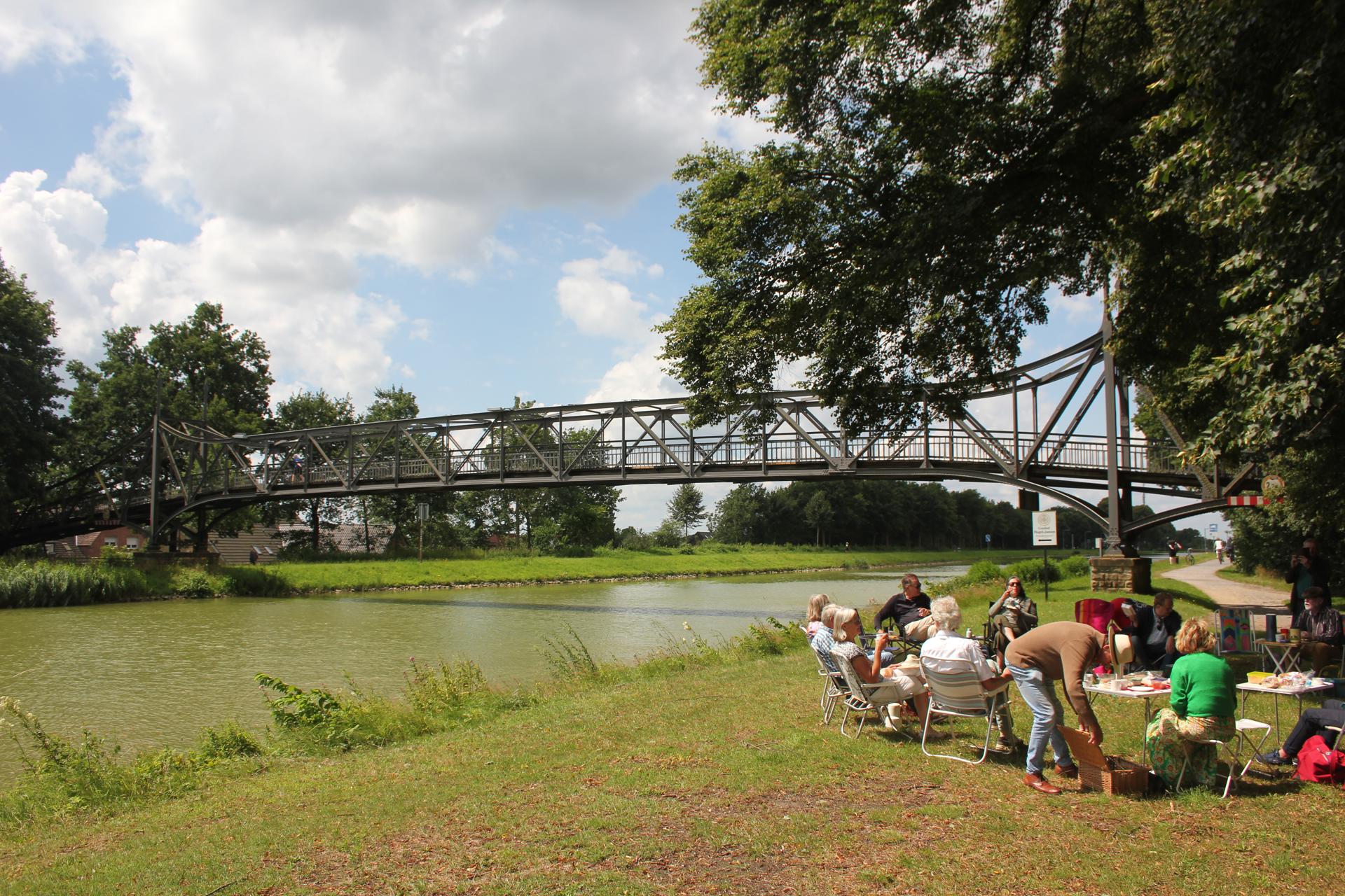 Over een brug, langs een 'berg' kom je tussen de kanalen terecht. Das Nasses Drieeck is dat, een belangrijk knooppunt voor de Duitse binnenscheepvaart. De plaatselijke eetgelegenheid was net gesloopt, dus wij hadden zoals verzocht onze picknickmand meengenomen en plaatsen ons onder een mooie voetgangersbrug. Met de appeltaart van Leontine als extra verrassing was het goed vertoeven.