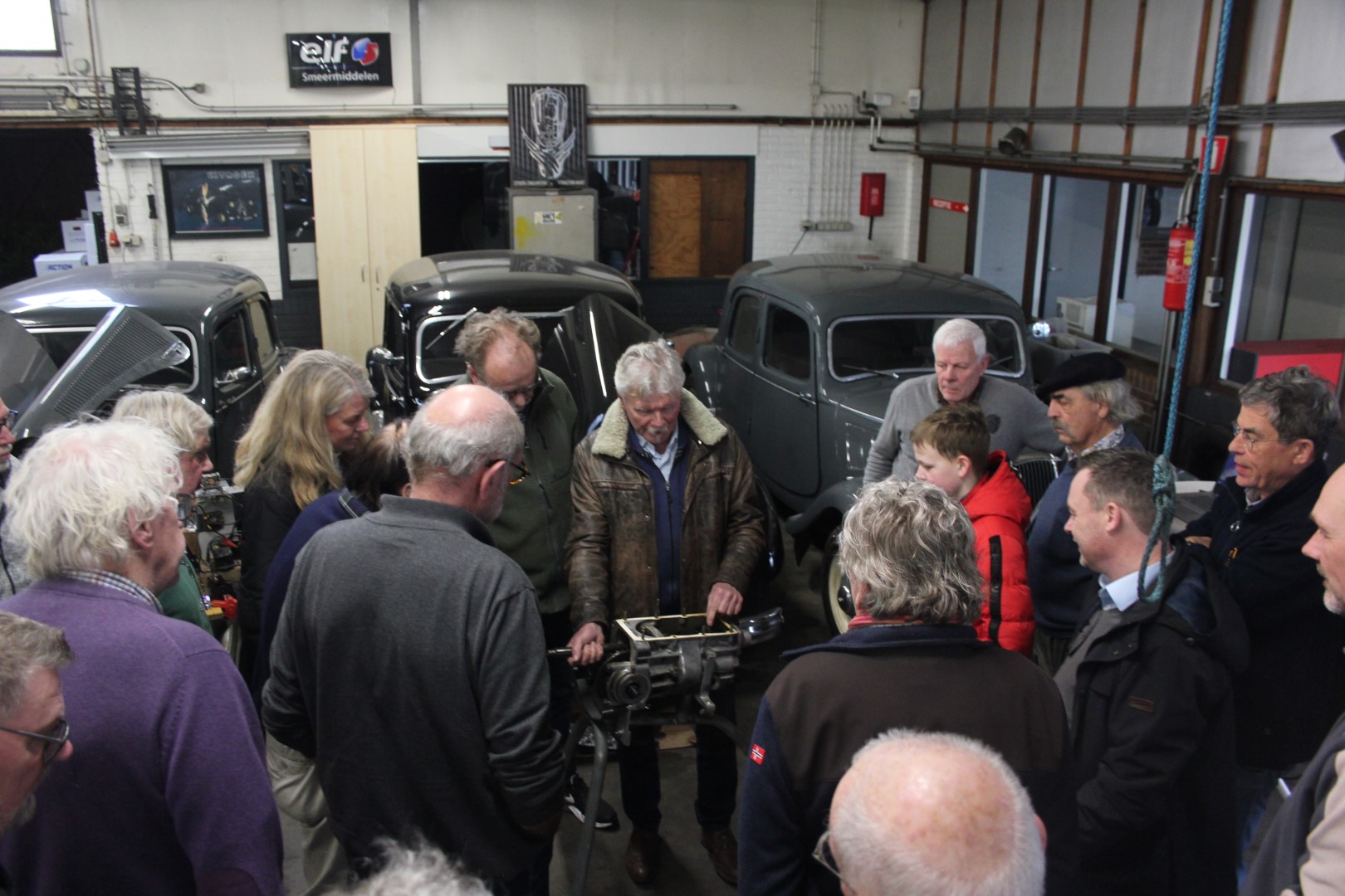Er was een driepoot beschikbaar om de versnellingsbak te bevestigen zodat iedereen het goed kon zien. Alles wat er ongeveer mis kan gaan met een versnellingsbak passeerde de revue, en dat is heel wat: geen olie, te weinig olie, aanduwen van de Traction, verkeerd schakelen, afremmen op de koppeling, slijtage van de lagers, vroegere en verkeerde reparaties, verkeerde afstelling, de synchromesh die versleten is, de schakelvorken, de afstelling van de blokkeerstift en het druklager, revisie, een huilende versnellingsbak, enzovoort. Jullie raden het al: er waren voldoende ervaringsdeskundigen in de zaal, dus ook dit verhaal werd mooi ondersteund door de praktijk!