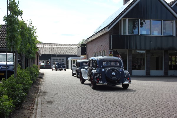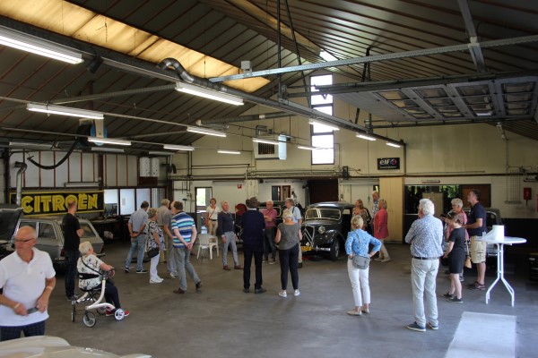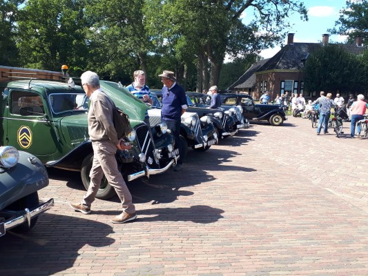 Na een tijd stilte vanuit de club werd op 12 juli weer een gezelschap van ruim 30 man en vrouw verwelkomd bij Bob en Dorothée in Borne. De prachtige tuin gaf ruimte om te genieten van de koffie en koek die geserveerd werd. Na de eerste bijpraatronde werden we door Bob gemaand plaats te nemen in onze auto’s en achter hem aan te rijden naar een fotolocatie. Zelf was ik met de fiets, en daarom kroop ik bij onze voorzitter achter in de Six Cabriolet, een ervaring die me naar meer doet verlangen!