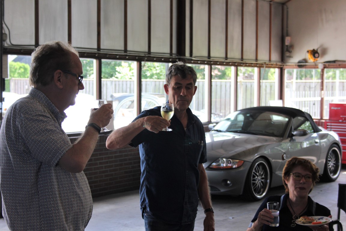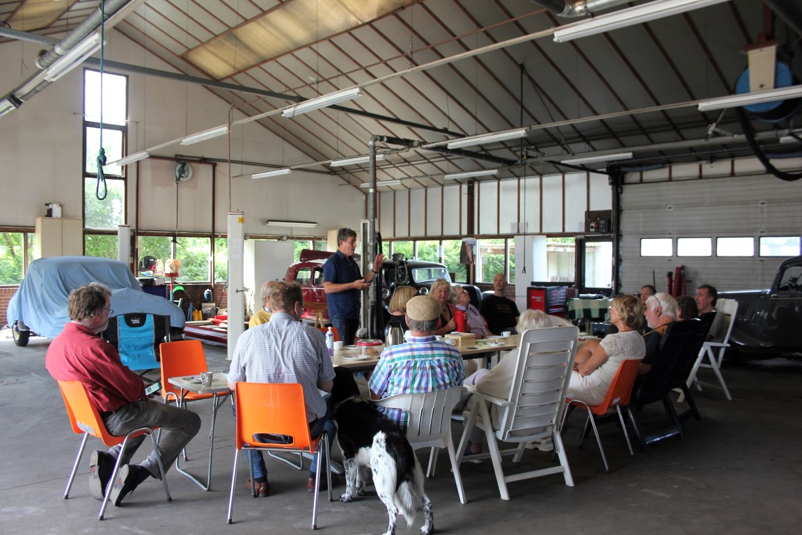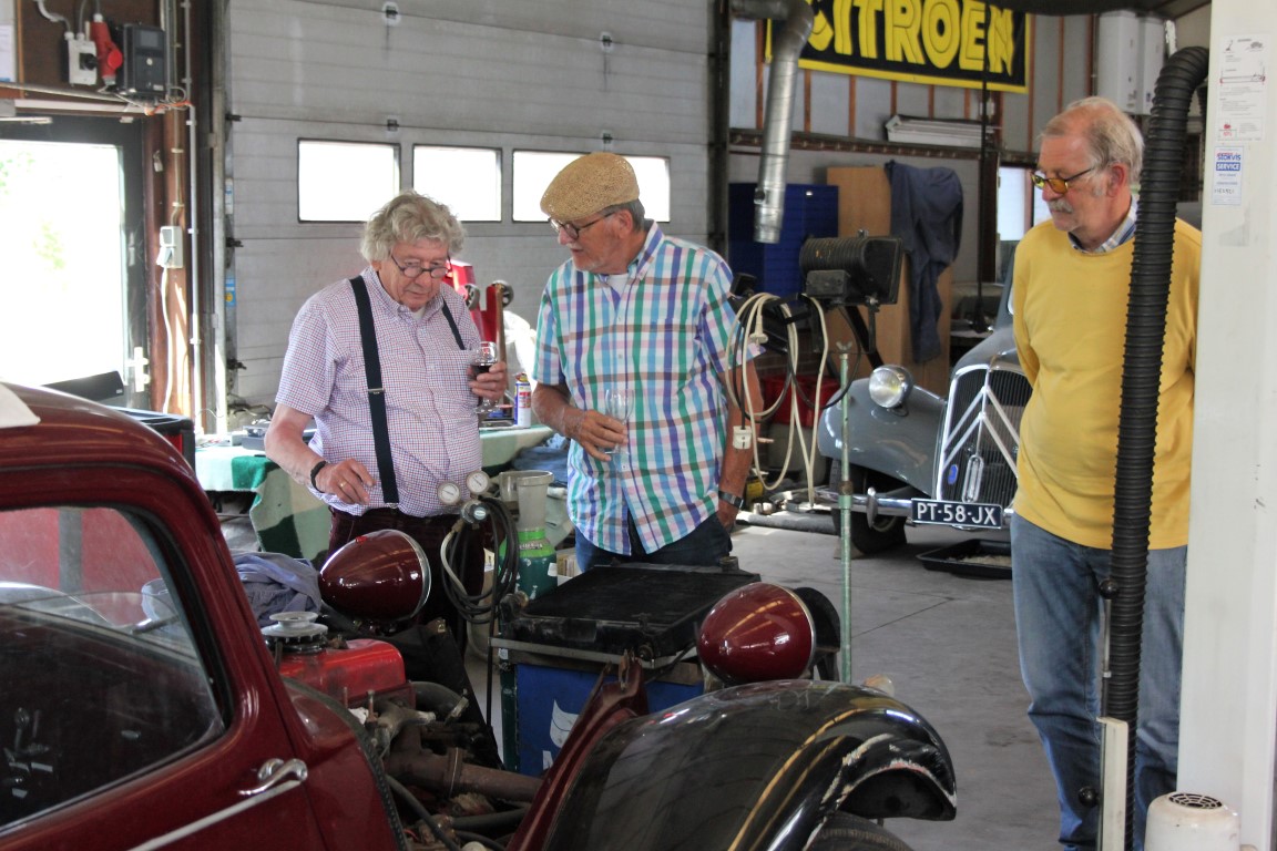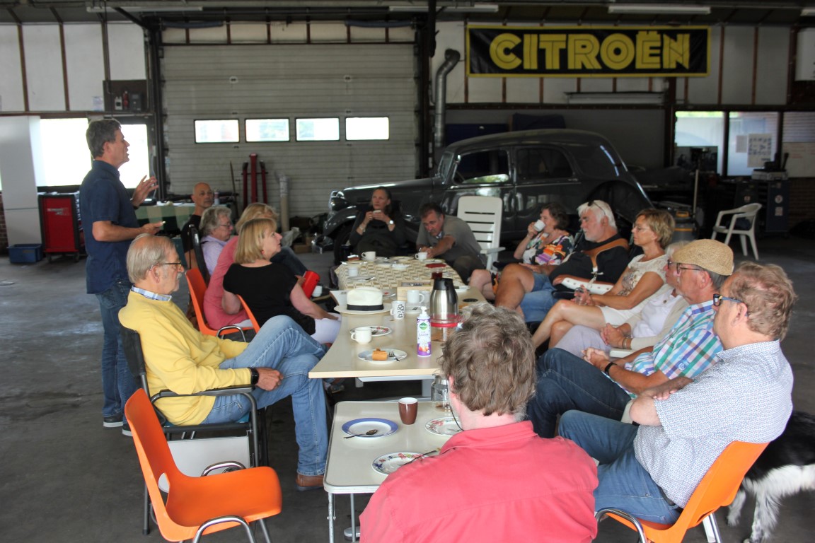 Tijdens de ontvangst bij het sleutelhonk in Azelo bleek al dat Andrés zenuwen voor niets opspeelden, het bleek perfect geregeld. Er stond een lange tafel met stoelen opgesteld, de koffie pruttelde en de taart werd al aangesneden. Dat onder een passend deuntje van de platenspeler die Wilbert had meegebracht. De sjoelbak die deze sportieve jongeman had meegebracht bleef onbenut, want er was veel te bespreken voor de leden die elkaar vaak lange tijd niet gezien hadden. Onze voorzitter Frans wist er nog net tussen te komen met een lading mededelingen, onder andere over het zoeken van vrijwilligers voor Citro Classica in september en over het informatiebordje voor op hun auto dat alle leden gaan krijgen. (mail daarover volgt)