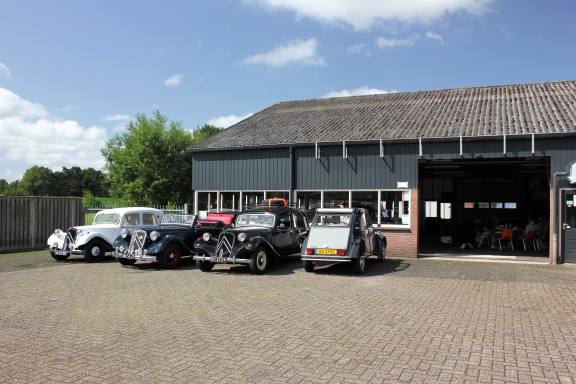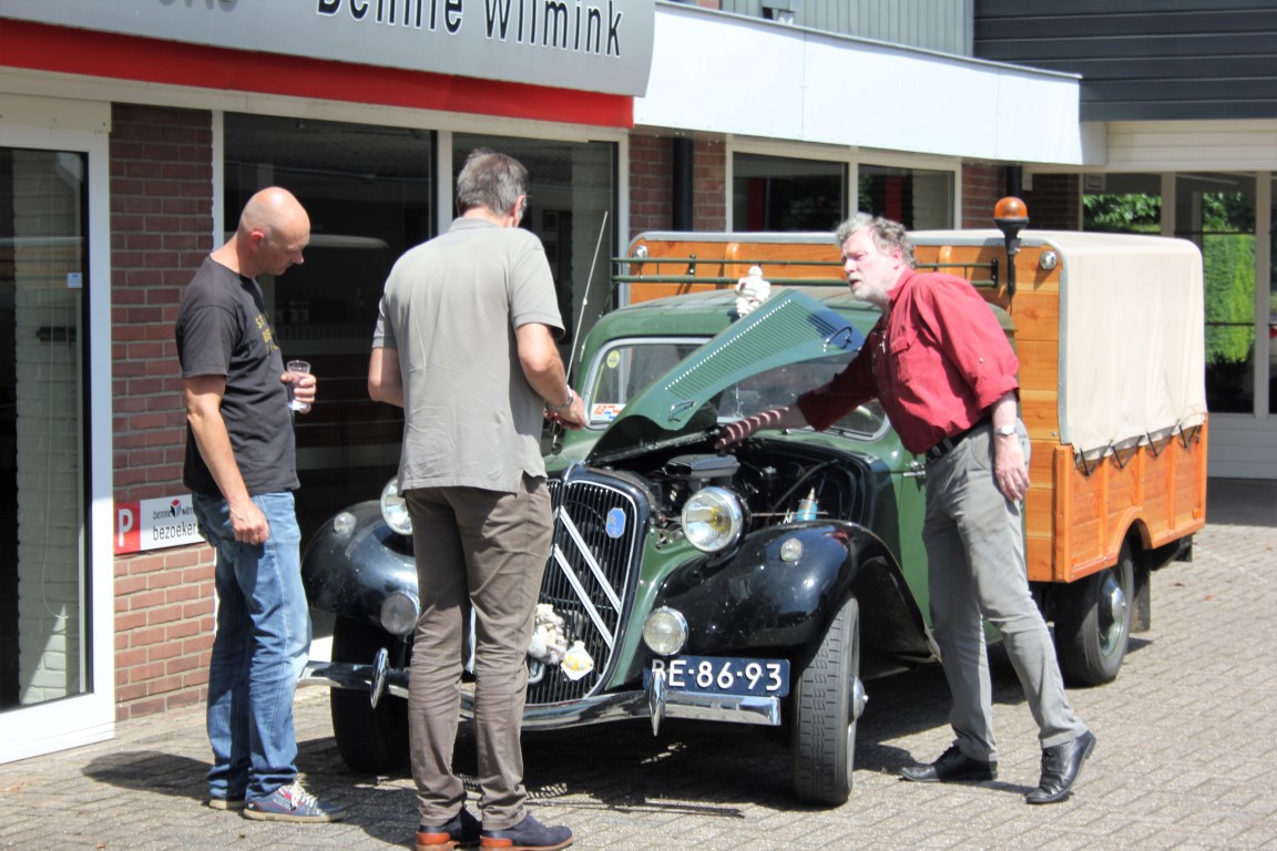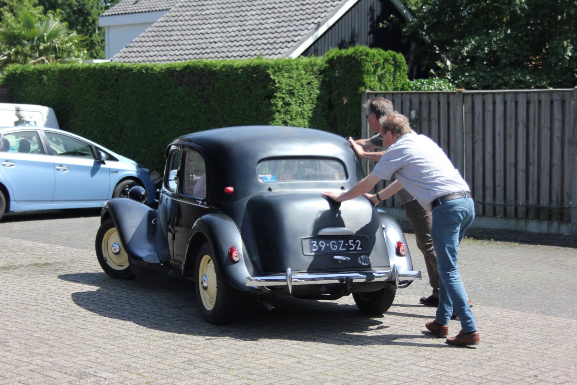 Deze zaterdag was de vuurdoop van André K. als zelfstandig evenementencommissielid. Om zijn zenuwen te temmen en de verwachtingen niet te hoog te spannen, was het motto ‘we doen vandaag niet moeilijk’. Om die reden konden we er niets van zeggen dat enkele leden met modernere voertuigen aan kwamen rijden dan onze Tractions. Waar een snoek hier en daar nog wel vaker gezien wordt, waren nu zelfs twee eendjes present. Daar was het dan ook perfect weer voor, zonnig met een hoge gevoelstemperatuur. De leden die met voertuigen uit de huidige eeuw aankwamen waren zo verstandig om bij andere leden in te stappen. Het is toch veel leuker rondrijden in een oldtimer.